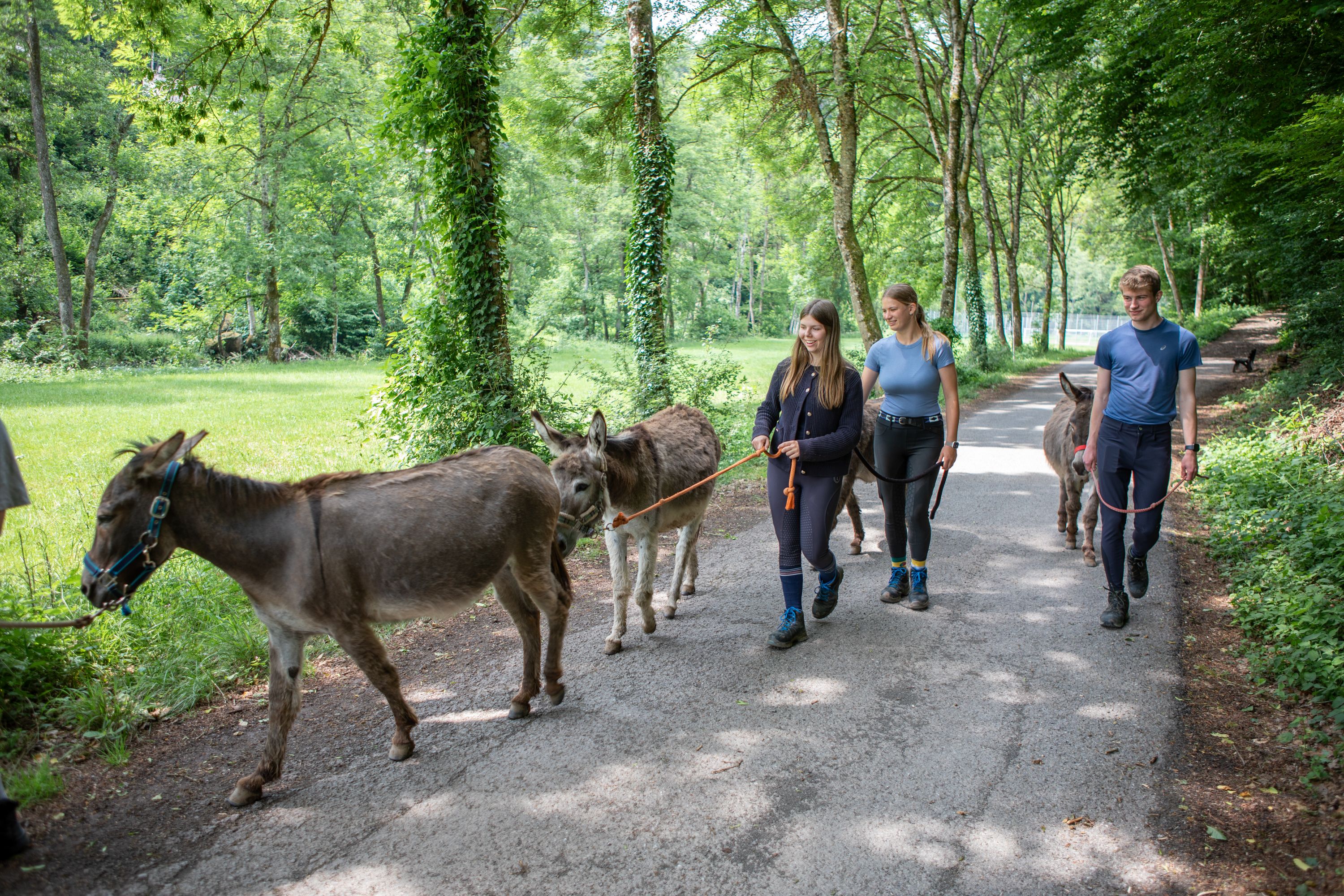 Wir bereiten gemeinsam die Esel für den Spaziergang durch die schöne Eifellandschaft vor. Beim Putzen lernen Esel und Mensch sich kennen. Daraufhin führt der Weg durch Wißmannsdorf entlang dem Fluss Prüm, es geht bergauf zu den Steinbrüchen vorbei an Kuhweiden und durch den Gonesbüsch zurück nach Wißmannsdorf. Nach dem Spaziergang kannst du noch im Nengshofgarten verweilen.