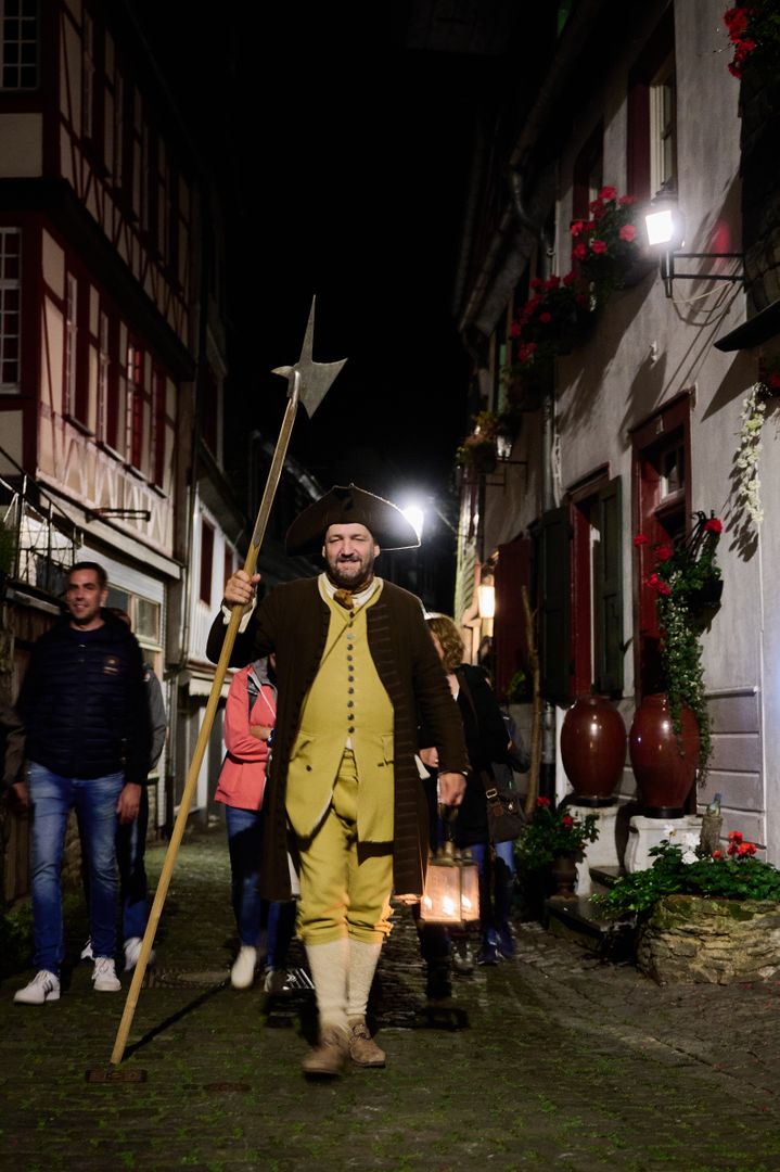 Begleite den Nachtwächter in seinem historischem Gewand auf einer Stadtführung durch die Altstadt von Monschau – ein besonderes Erlebnis in der Abenddämmerung.