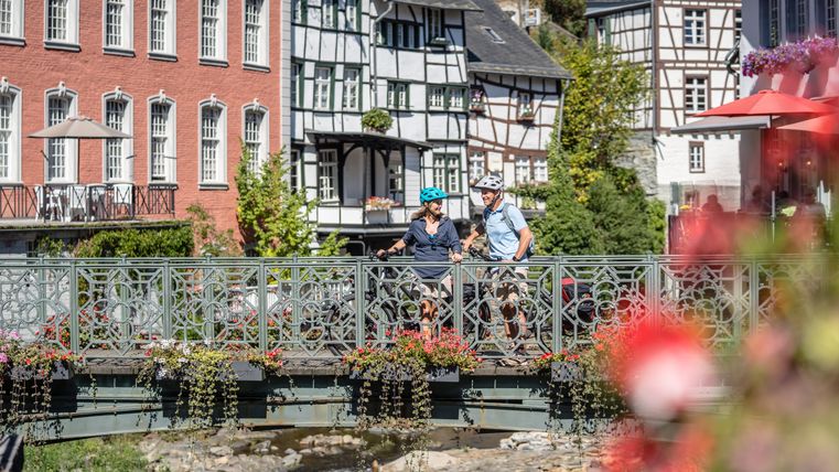 On the long ridges and gently undulating plateaus in the German-Belgian High Fens-Eifel Nature Park, everyday life is far away. Monschau with its unique half-timbered architecture, the cozy town of St. Vith in East Belgium or the abbey town of Prüm in the Schneifel are embedded in a world that opens up the senses: You cycle through fragrant mixed forests that are home to wild cats and red deer, through the vast moorland of the High Fens and along the shores of the Rursee, Urftsee and Obersee lakes.