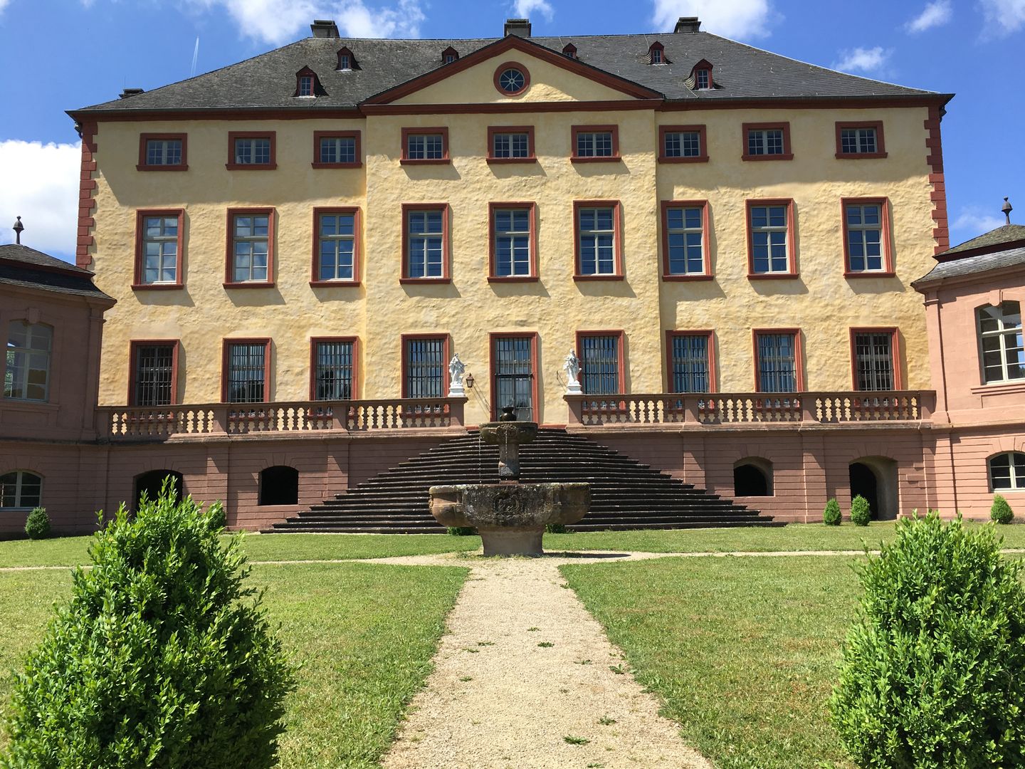 Malberg Castle dates back to a castle mentioned as early as 1008. Nothing remains of the medieval building. The Veyder family took over the castle in 1681 and from 1708 to 1715 Matteo Alberti, an architect from Venice, had it converted into a castle in the Venetian Baroque style. The representative buildings contain stucco ceilings and wood paneling as well as tapestries and old furniture. A painted wall covering with hunting scenes is unique.