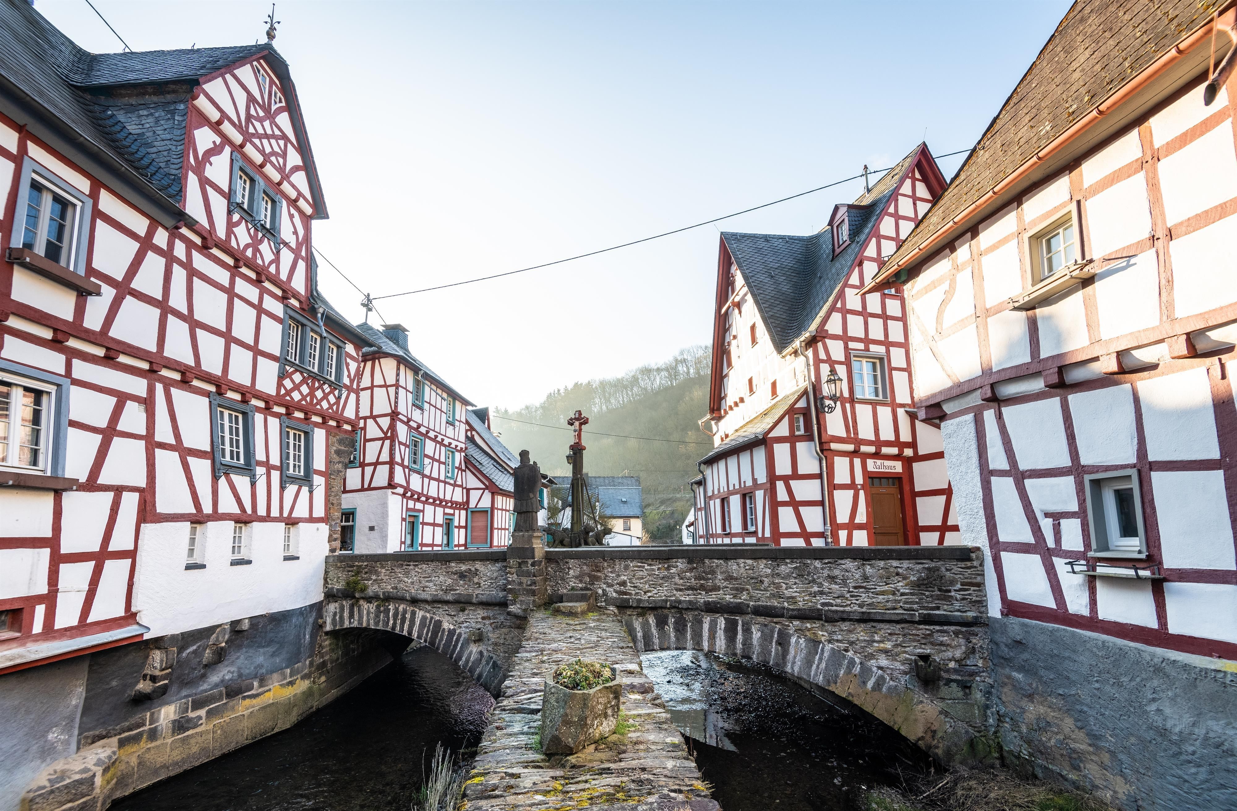 The four-gabled house and the picturesque half-timbered houses provide the perfect backdrop for the colourful market activity on the Monreal market square below the two Monreal castles - Löwensburg and Philippsburg.