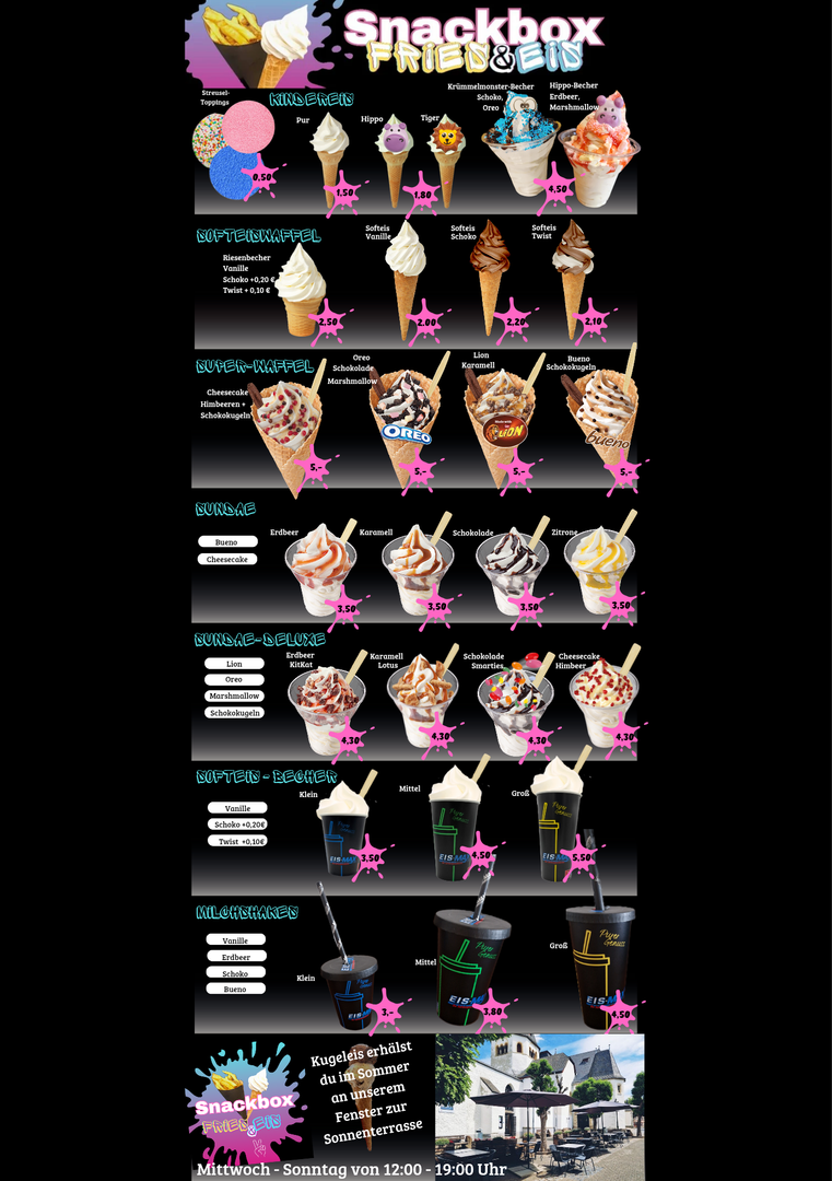 Enjoy fresh & homemade fries in the heart of Adenau on the small terrace in the marketplace, along with delicious Dutch specialties (Frikandel, Kipcorn, beef croquette, Bamischijf), classic chicken nuggets, and fresh butcher's currywurst.