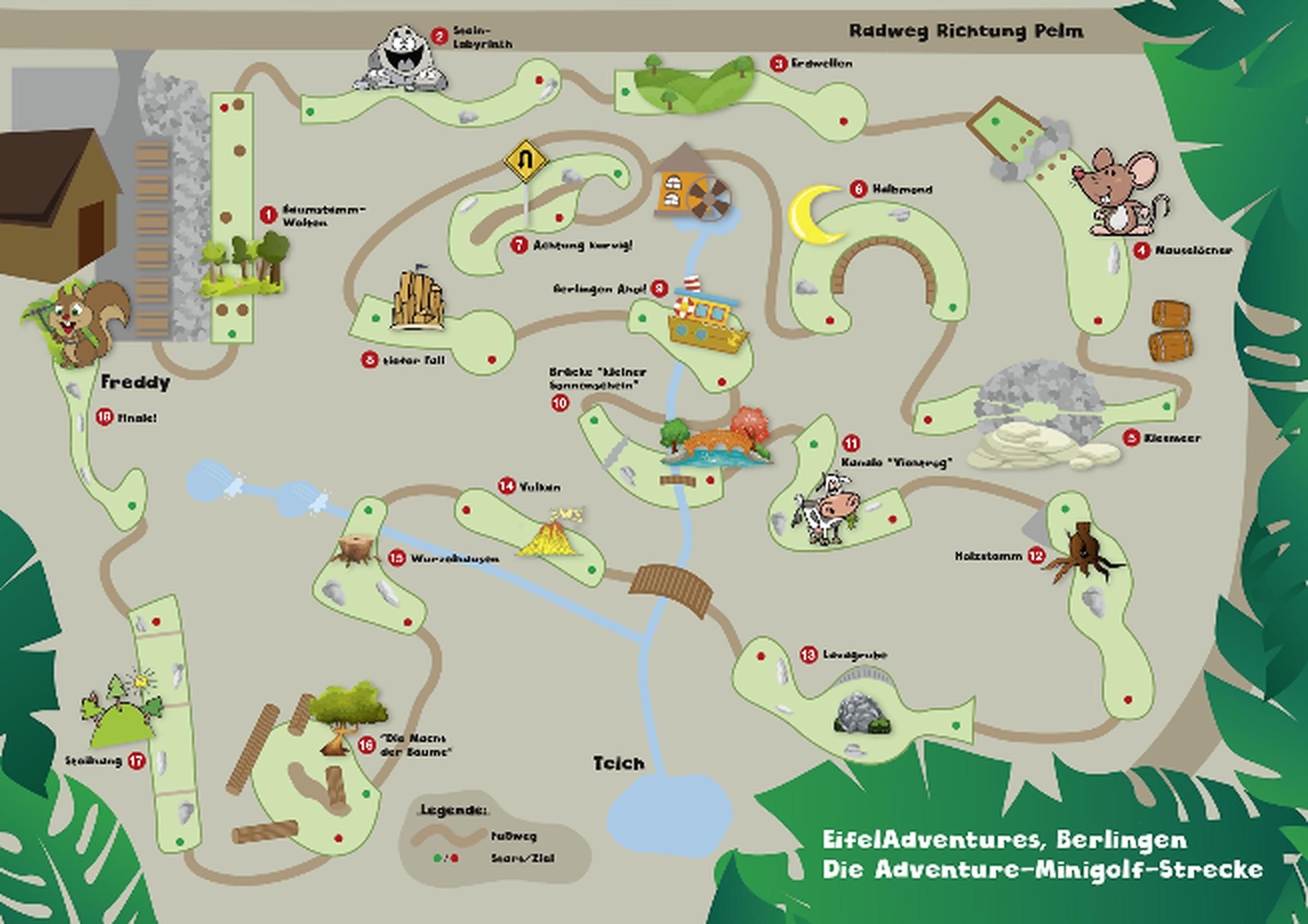 The entire adventure mini golf course of EifelAdventures in Berlingen is lovingly integrated into nature. On a total of 2,500 square meters there are 18 lanes in beautiful surroundings. Obstacles are mainly natural materials such as tree trunks, stones, roots and hills. The tracks are made of artificial grass. Obstacles are mainly natural materials such as tree trunks, stones or hills. Only those who manage to play around the tree trunks, hit the right mouse hole or cross the stomach tube will experience how nice it is to be a real adventure mini-golfer. In addition, EifelAdventures in Berlingen offers the opportunity to play the 18-hole adventure mini golf course once a month in the dark of the night, in the light of the full moon. Each guest receives a headlamp and can experience a very special night-adventure mini-golf event with light balls as the sun goes down and the stars rise in the sky. Experience PUR for young and old!