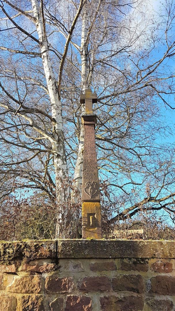 The almost three-meter high slender shaft cross in the far corner of the chateau park bears the typical form ornamentation of the Baroque period. The strikingly high, rectangular base of the cross is adorned with diamond cuboids at the front and sides. After a "pinch-off", above it rises a cross shaft tapering towards the top, which is almost completely covered by the inscription.