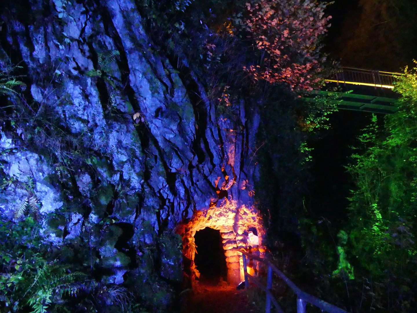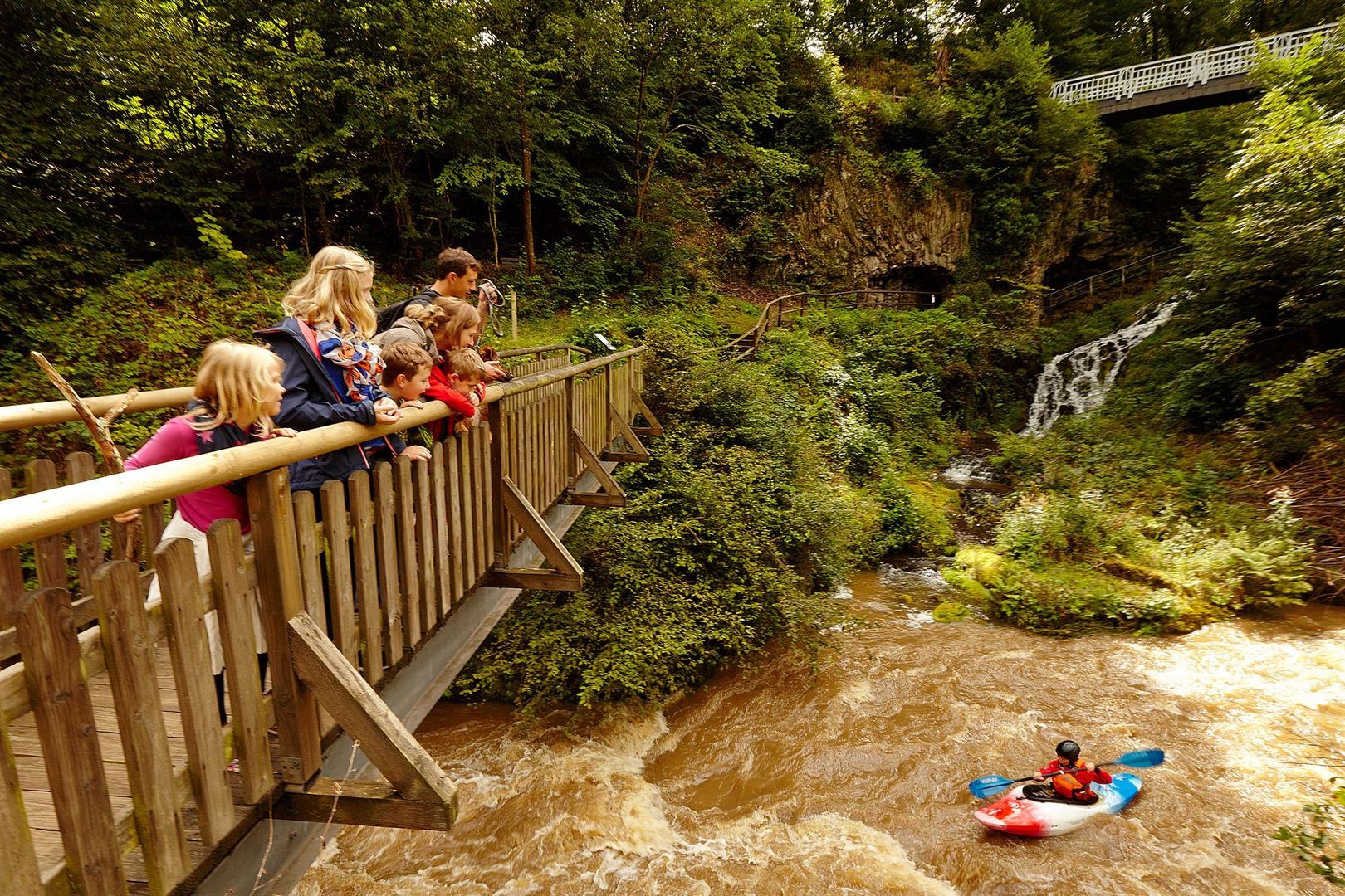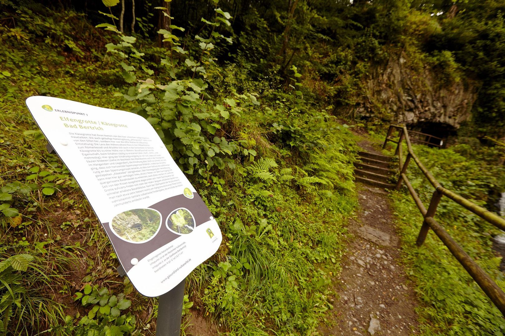The enchanted Elfengrotte near Bad Bertrich is a popular destination especially for little GesundLand visitors, because here fabulous fairy tales come to life before your inner eye. Sink for a moment into legendary stories and old legends when you visit the small cave. The cave is located directly on the "HeimatSpur Spazierweg Elfengrotte", which is 2.4 km long and can be easily mastered even by children. Right next door, the Elbesbach waterfall plunges into the depths with a roar. This place owes its nickname "Käsegrotte" to the shape of its stones, which resemble round cheese wheels. The cave was formed many thousands of years ago, when glowing hot basalt lava flowed from the high volcanoes into the Üssbach valley and created a unique landscape there. As it cooled, the basalt lava solidified into columns in which horizontal stress cracks developed. Weathering over the centuries created the shape of stacked cheese wheels, which give the Elfengrotte its special appearance.