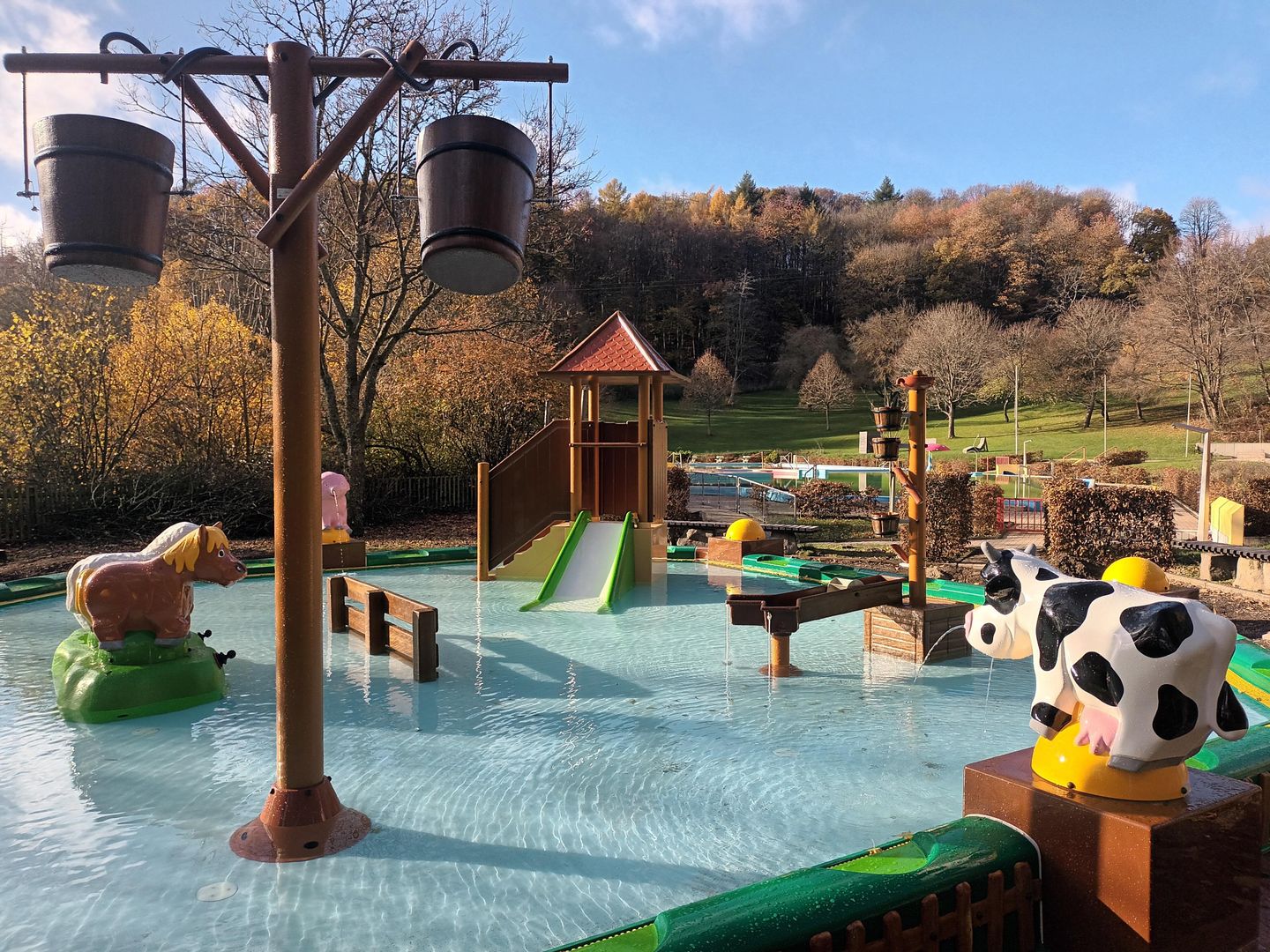 It offers heated pools, great fun in a colorful water landscape, children's paddling pool with lots of colorful play elements, mushroom with massage bench, flow channel, wide slide and much more - endless fun!
