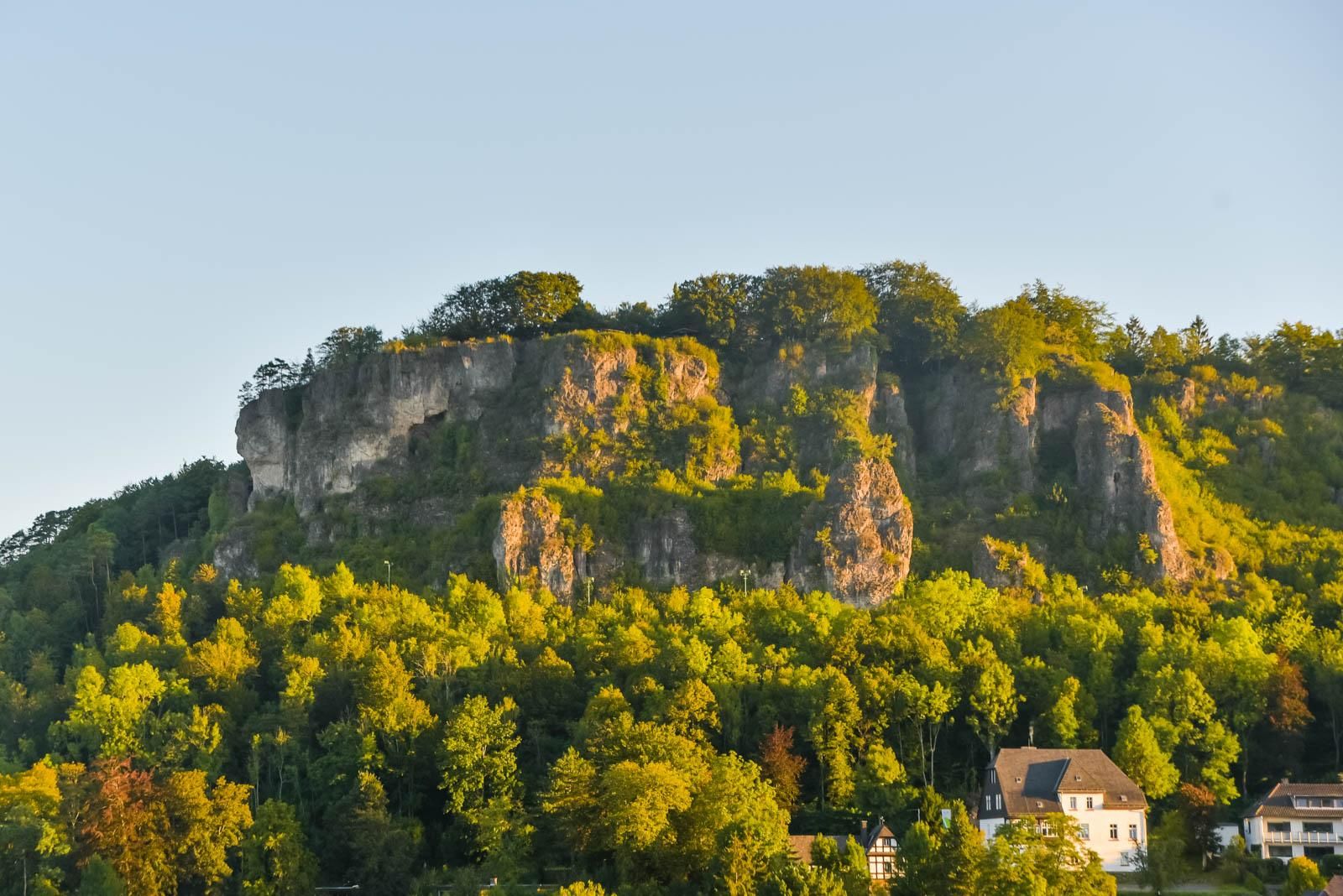 Around 380 million years ago, there was a warm, subtropical flat sea in which massive reefs formed from stromatopores – relatives of sponges – and corals. After the dolomitization, sinking and folding of the rocks, the Devonian deposits were excavated again. The present-day Gerolstein Dolomites were formed, which rise steeply above the Kyll valley north of the centre of Gerolstein. The rocks “Hustley”, “Munterley”, “Drohende Ley”, “Große Kanzel” and “Auberg” shape the cityscape from afar and form Gerolstein’s landmark. The most famous peak of the Gerolstein Dolomites is the "Munterley" - with a height of 482 meters - and offers a breathtaking view over Gerolstein, the Kyll valley and far into the volcanic Eifel. This view was obviously enjoyed by Stone Age people who settled here 30,000 years ago, as evidenced by stone tools and bones found at the nearby Buchenlochhöhle.