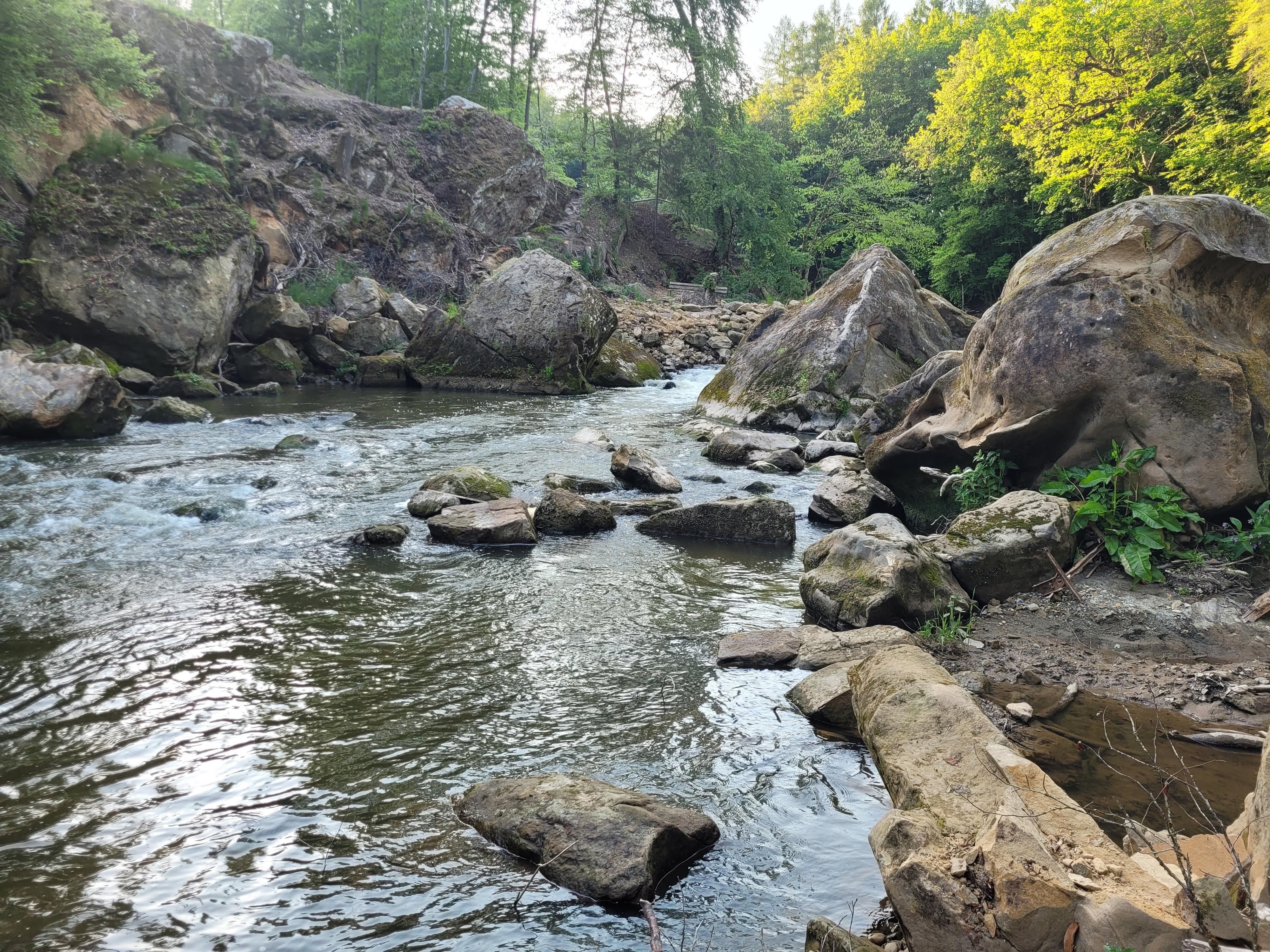 One often reads and hears that the "Irrel waterfalls", the imposing rapids of the Prüm, no longer exist since the flood disaster of 2021. In fact, the flood has left more than clear traces in the narrow valley through which the river flows between Irrel and Prümzurlay: The water masses not only destroyed the covered footbridge, but also shifted entire boulders, caused enormous landslides, greatly altered the riverbed and left behind a sea of stones and sand, uprooted trees and flotsam. Yet the place has lost none of its fascination.