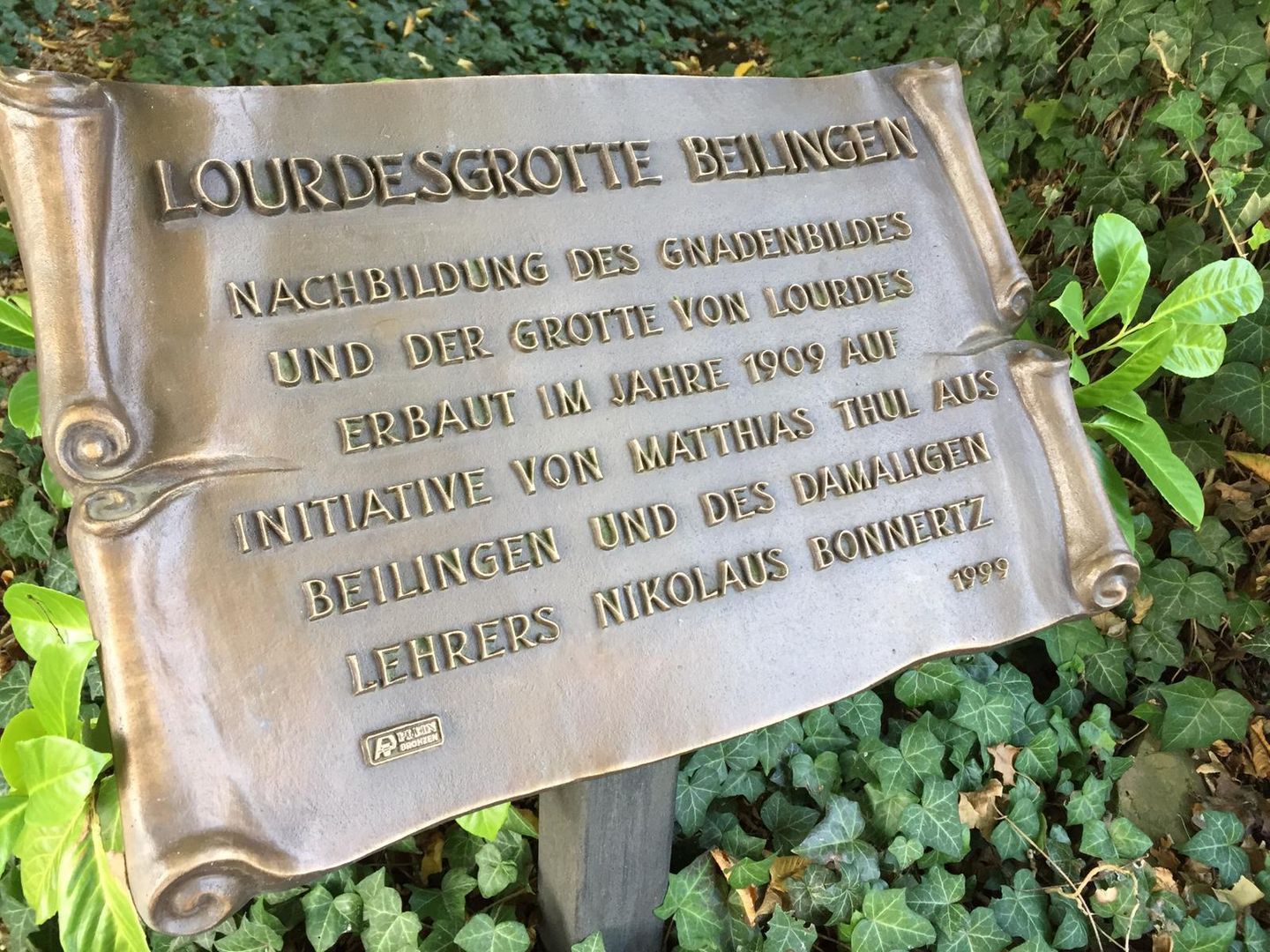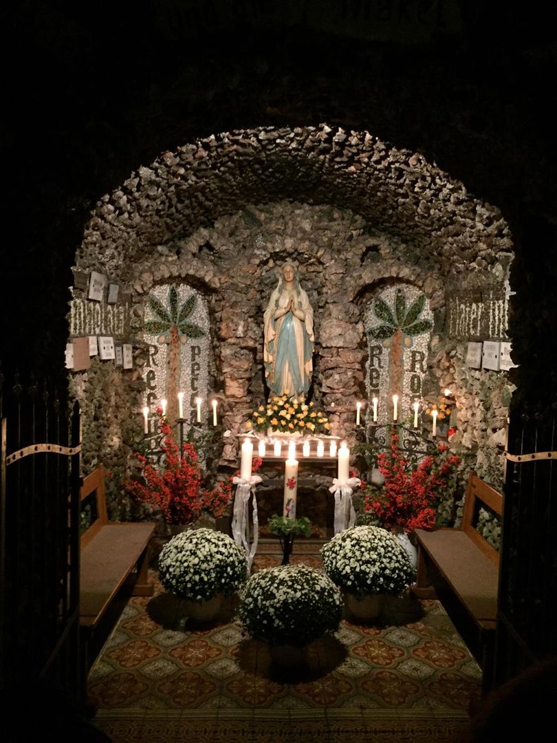 The Lourdes Grotto is located in the community of Beilingen. It was built in 1909 on the initiative of Mr Nikolaus Bonertz. Throughout the year the grotto is visited by many believers and pilgrims. At the beginning of october there is an annual light procession to the Lourdes Grotto. Inside and outside the grotto is covered with lava slag. Ivy, moss and trees grow all around. The grotto is located on a field (In den Borstücker) near the street "Zur Grotte". Every year at Pentecost there is a "walk to the grotto"; on the first Friday in October a light procession to the grotto is organized.
