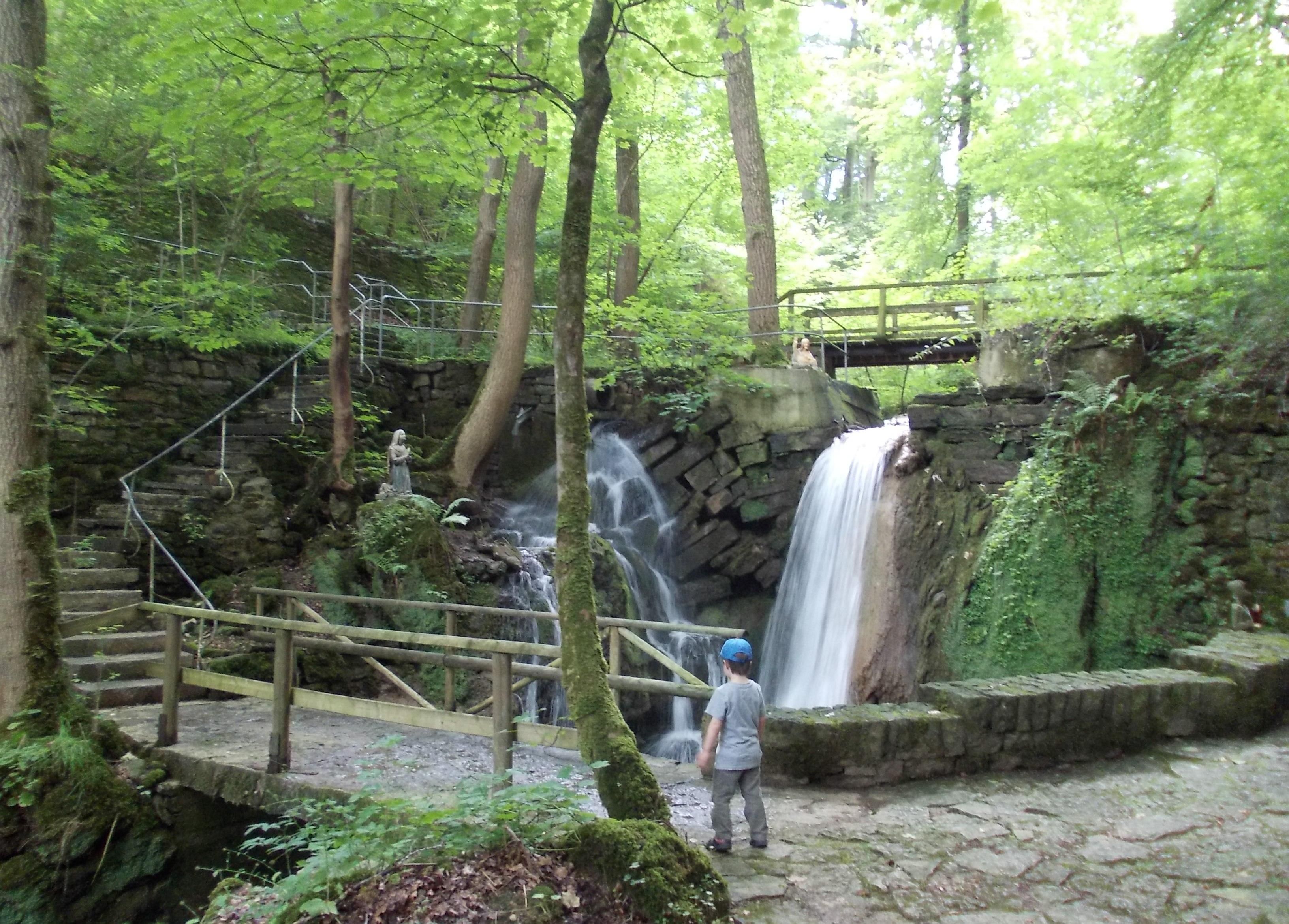 East of Bitburg, about 3 km away, lies the Albachtal in an idyllic limestone gorge. Stairs of natural stone (caution: danger of slipping) lead to the enchanted place of the Mariengrotte. Moss, ferns and clover line the path to the left and right. After a short time, the view of a waterfall and the Mariengrotte opens up. The Albach forms several small waterfalls until it flows into the wider Albachtal valley. The biggest waterfall is to be found at the Mariengrotte, which is located in the valley. For generations it has been a place of Marian devotion and a destination for many pilgrims. The oldest tablet dates back to 1940 and there is a small water source in the grotto, which is used by visitors as holy water. At the memorial site, there is also a kneeling Mary on the opposite side of the dominant statue of the Virgin Mary.