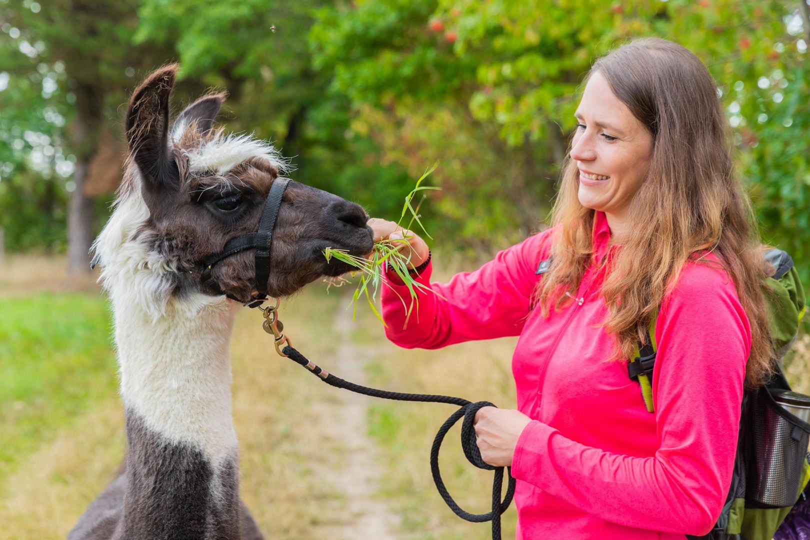 Our hikes are mostly on forest and meadow paths through the Eifel. After an introduction with interesting facts about the species and nature of our llamas and alpacas, you will get to know the carefree, gentle creatures better in preparation for the hike. Enjoy the beautiful nature of the Eifel in different seasonal impressions with changing landscapes and views at a leisurely walking pace. These gentle and fuzzy companions captivate everyone with their fascinating beady eyes. Slow down your hectic everyday life in harmony with nature and animals. The llamas & alpacas set the soothing serene pace that lets our soul dangle and refuels our energy store in a relaxed way.