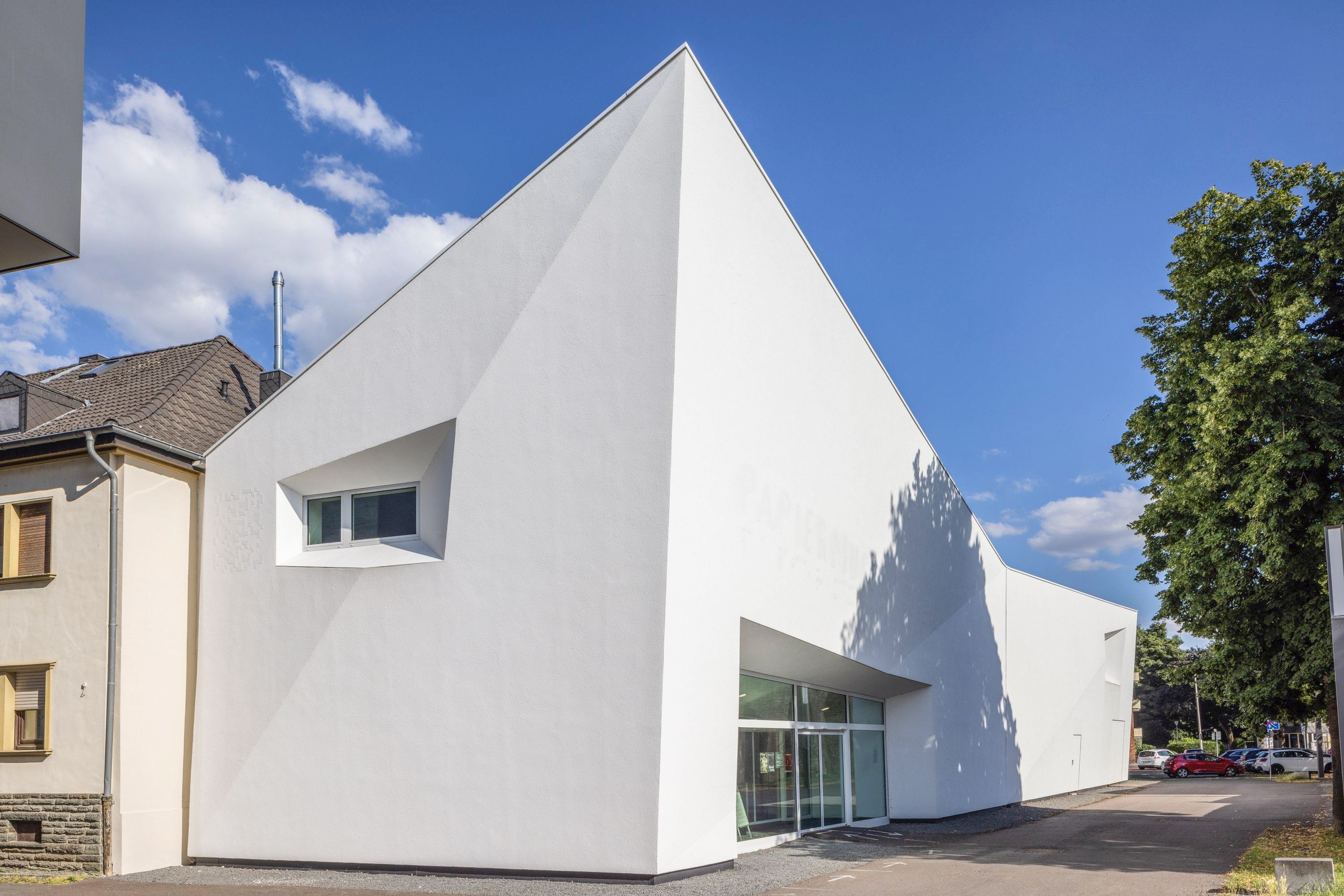 Like a folded sheet of paper, the new Papiermuseum Düren appears right next to the Leopold-Hoesch-Museum in the urban space. The museum, which was reopened in 2018 after a comprehensive redesign and fundamental architectural expansion, is dedicated to paper, a material whose production and processing has a centuries-old tradition in Düren. In addition to the architecture, Cologne based architect Klaus Hollenbeck, together with curator Caroline Kaiser, also developed the interactive design of the interior: various stations make the exhibition digitally, haptically and audibly experienceable, especially for people with visual impairments. Paper Art and the latest developments in the field of paper are also presented. The traditional paper making (Sundays, 1 – 4 pm) rounds off the museum visit.