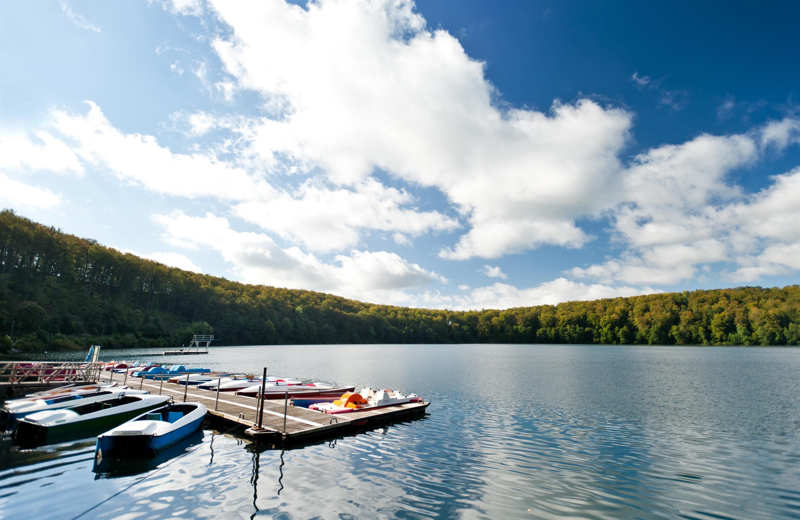 The Pulvermaar is like a picture from storybooks: It is the best preserved maar in the Eifel. The cone is entirely filled with water and surrounded by an almost closed tuff ridge (max. height approx. 45 m). It is also the maar lake with the largest expanse of water and greatest depth in the Eifel and one of the deepest lakes in Germany!
