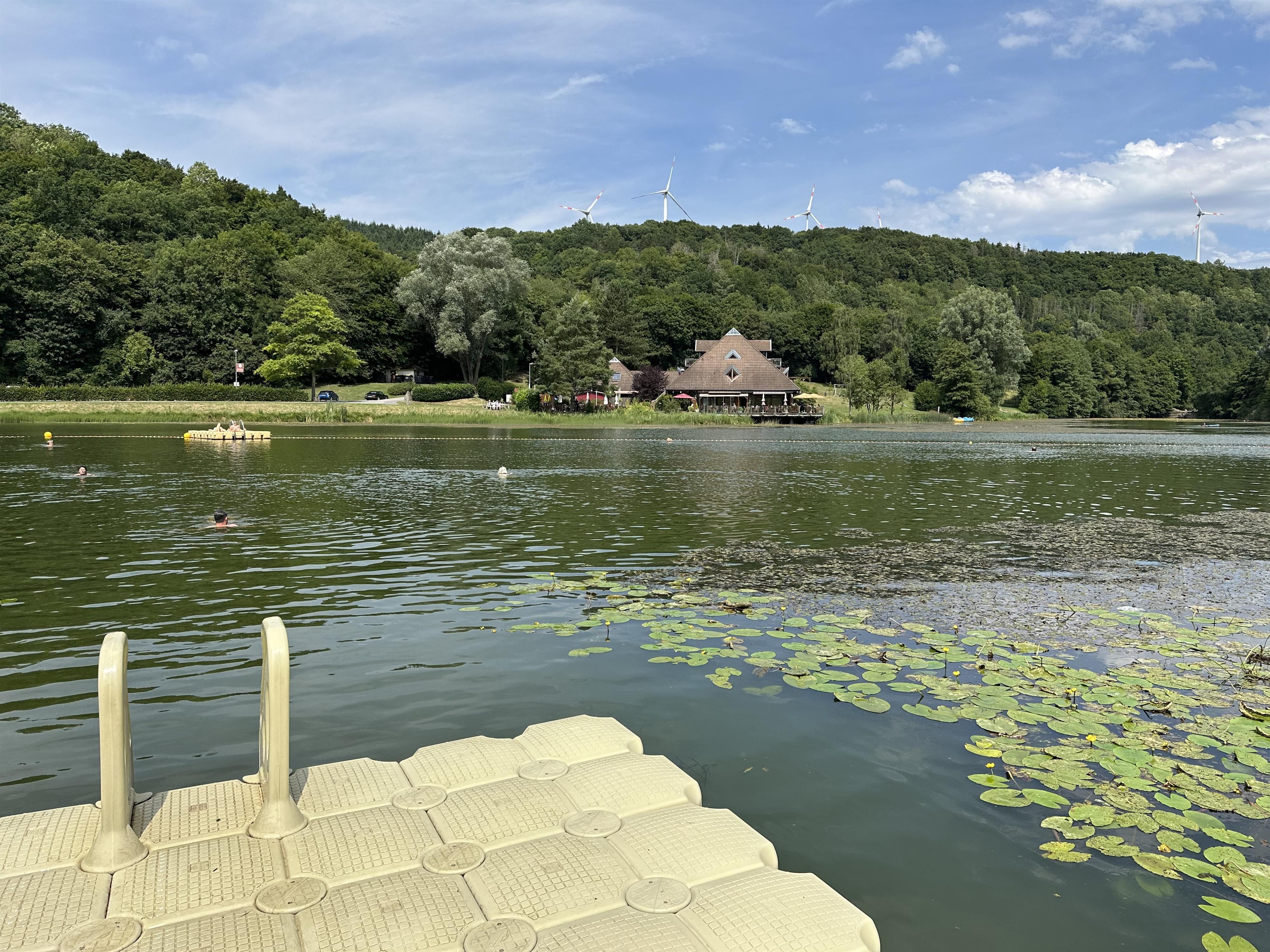 Between the Riedener Mühlen and Rieden is the reservoir with a water surface of about four hectares, which is fed from the Rehbach. Because the source originally came from the rectory, the forest lake is jokingly referred to as the "largest holy water basin in the world". The lake is owned by the Zweckverband Waldsee Rieden. The lake is located in the Mayen-Koblenz district and has an area of around 40 hectares. At its deepest point, it goes down 8 meters in the lake. The next major city to visit the lake from is Mayen. Nearby are the lakes Laacher See (approx. 8.1 km), Waldsee (approx. 9.9 km) and Heilbachsee (approx. 19.8 km). The lake is used for swimming when the weather is nice , the water fulfills the guidelines of the European Union (EU) as bathing water, offers an excellent water quality and thus an uncluttered bathing pleasure. Two bathing jetties make it easier to enter the water. Sunbathing areas right on the shore, children's play and barbecue areas, tennis, boat rentals, boccia and chess, laid out walking paths and a bathing plateau make your stay varied. A hotel restaurant with Seestraße ensures the well-being of the visitors. A building with changing rooms and sanitary facilities complete the offer. Holiday village on the Riedener WaldseeIdyllic and directly on the Waldsee Rieden there is a holiday park in the middle of the Eifel volcano park for nature lovers who want to escape the loud and hectic hustle and bustle of everyday life. Embedded in a gently rising valley, surrounded by mixed forest with imposing beech trees, some of which are 100 years old, the holiday homes nestle on the south-eastern slope of the Schmalberg in several terraces without through traffic, whether for a short weekend break or your annual vacation - the time in the holiday village is ideal for Shut down and relax.