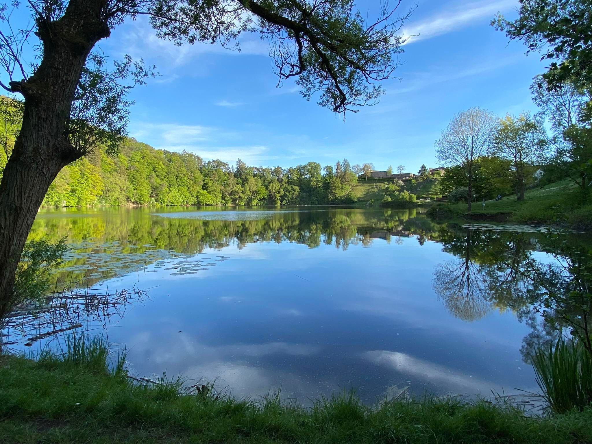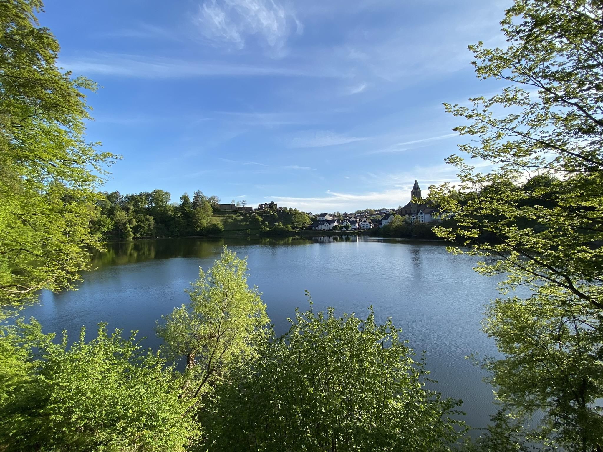 Today, the Ulmen Maar is 420 metres above sea level, has a surface area of 5.5 hectares and is 36 metres deep. The fact that volcanism is still active is shown by bubbles at the edge of the maar. They bear witness to its roiling past - but don't worry, there is no eruption in sight! An up to 20-metre thick wall of various rocks and ashes surrounds the funnel. For those interested, these witnesses of the explosive past are wonderfully open at St. Matthias Church. This unique wall with its differently coloured layers and round inclusions is not only worth seeing for geologists. The slopes of the Maar basin are overgrown with a beautiful forest, which can be discovered on a circular route. A detour up to the medieval castle ruins, from which crusaders once set out on their battles, is recommended. The view from the crater rim over the Maar and the Eifel behind it takes your breath away. Be it after a sweaty hike or a long car journey - the blue of the Ulmen Eifel Eye glows all too temptingly in summer. But bathing in the Maar is prohibited because it is classified as a nature and water protection area. Instead, you can enjoy the good air while fishing for pike and carp. Perhaps you will even catch a glimpse of the giant fish that is the subject of an old legend. The charming town of Ulmen of the same name lies directly on the Maar. Here guests can stop off at various cafés and restaurants and enjoy a good cup of coffee or a delicious meal. Parking: Visitors are best advised to park at the Old Post Office Square or the Market Square in Ulmen. Both places are centrally located in the town, so it is only a short walk from there to the shore of the Ulmener Maar.