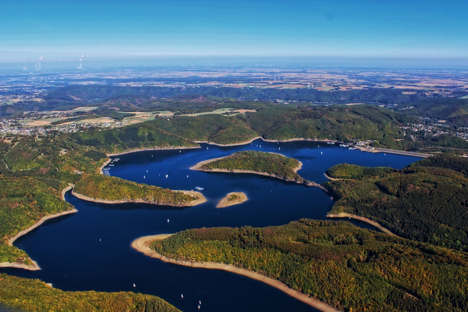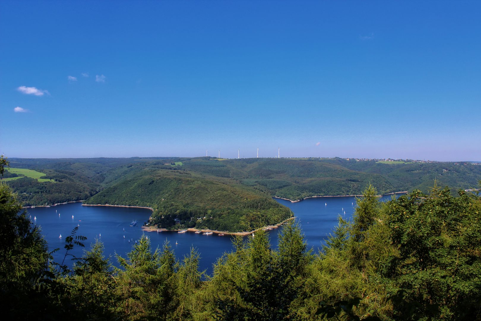 From Simonskall, the Bachtäler-Höhenroute runs through the Kalltal valley past an impressive geological rock saddle and then follows the beautiful Huschelbach valley up towards Schmidt. Here, too, there are impressive panoramic views of the Cologne Bay and the Eifel National Park with the Kermeter mountain range and the Rursee lake, to which you now descend through another stream valley in the direction of Eschauel. As soon as you reach lake level, the Bachtäler-Höhenroute leads uphill again to the Eifel viewpoint "Schöne Aussicht" on the Simonsley, where hikers can expect a breathtaking panorama in a southerly direction with views of the Rursee and the Kermeter. Passing another viewpoint, the trail descends again to the Rursee, along the banks of which you finally reach Schwammenauel.