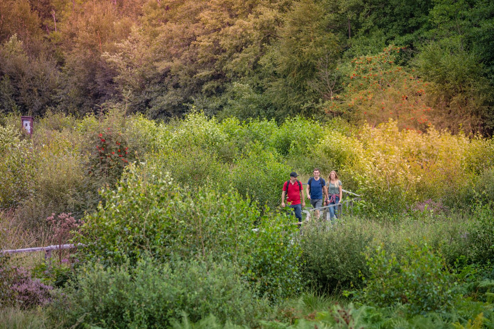 The nature trail leads you across the ecologically particularly valuable moorland areas of the "Todtenbruch". You can walk on a 700-metre-long boardwalk directly over the sensitive soils and through the headwaters of the Weiße Wehe without touching them. The moors cover an area of around 40 hectares and, at 3000 years old, are still relatively young in geological terms. Raised bogs are highly sensitive biotopes that can only form under very special conditions. There must be an impermeable layer of clay in the soil and the amount of precipitation must also be sufficient. Only then can the peat moss grow. You can find very rare plant species here, such as the carnivorous sundew, the fluffy white cotton grass, the pink-flowering bell heather or various orchids.