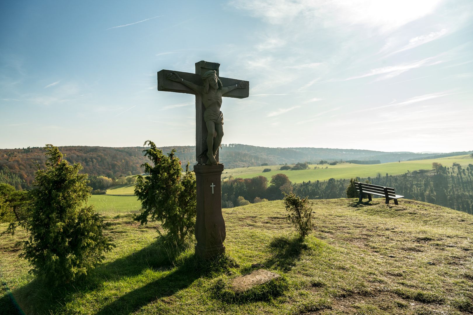 Orchids bloom in early summer and gentians in late summer. Numerous insects populate the flower-rich lawns of the limestone drifts. In the middle of the landscape, the Calvary rises above the landscape. From there, the view sweeps far across the landscape. The Hohe Acht, the highest mountain in the Eifel, rises on the horizon. Here you can feel the special magic of the Calvary and forget everything around you, at least for a moment.
