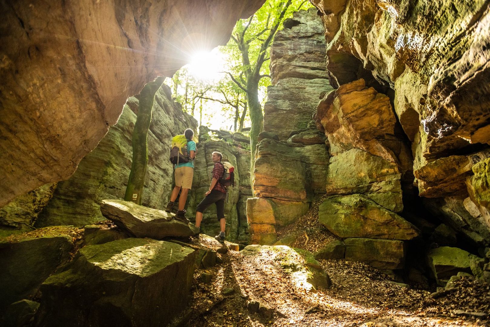The hiking routes in the NaturWanderPark delux are spectacular, three large landscape elements are the main protagonists of this route: the Ferschweiler Plateau on the German side, the Luxembourg Berdorfer Plateau and the deeply cut Sauer Valley in the middle. The circular route owes its character to the composition of breathtaking panoramas, picturesque rocky backdrops and mystical forests - crevasses, caves and via ferratas give it the adventurous spice - castle, villa and chateau add the romantic touch.