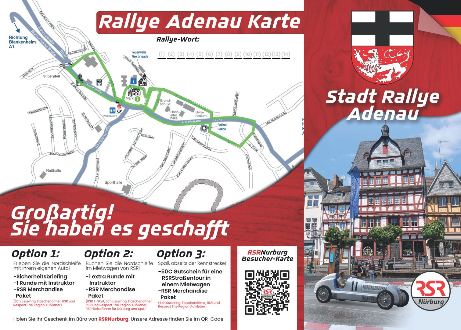 Discover Adenau's historic town center with exciting insights into the town's history & the history of the Nürburgring. In addition to the guided mulled wine rally at 2 p.m., you can also start at your own pace at any time: the route is digitally recorded and available for download. Along the way, there will be 3 refreshment stops with free mulled wine or punch. The limited-edition mulled wine rally mug is available to take home. There will be a surprise for successful participants at the RSR stand.