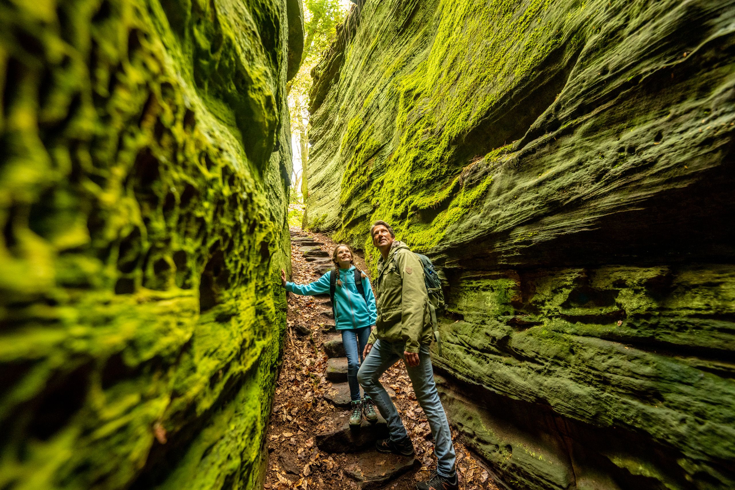 A forest path leads right into a fairytale world with weathered rock faces, gorges and crevices, mossy stone blocks and high rock towers. It is actually a 190-million-year-old seabed that has been moulded into these rocks by the forces of nature over the course of time. But it could also have been created by giants - or by the devil, who is closer to the Catholic south Eifel people.