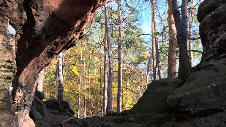 You hike comfortably down into the Rur valley and then climb back up through mixed forests. Finally, the Rur valley lies spectacularly at your feet as soon as you reach the Kühlenbusch viewpoint. Enjoy the fantastic view here before you finally start your way back at the famous red sandstone rocks of the Rur Eifel. They are around 220 million years old and offer you a walk through the colorful history of the Eifel.