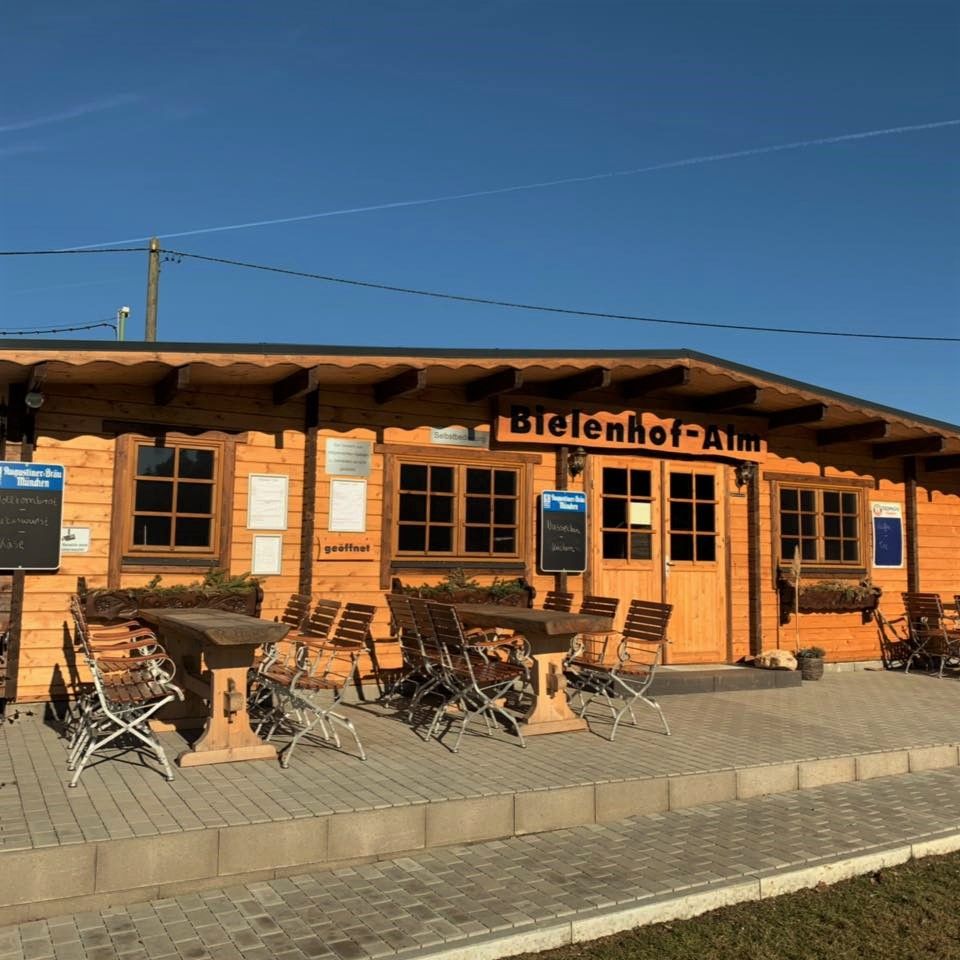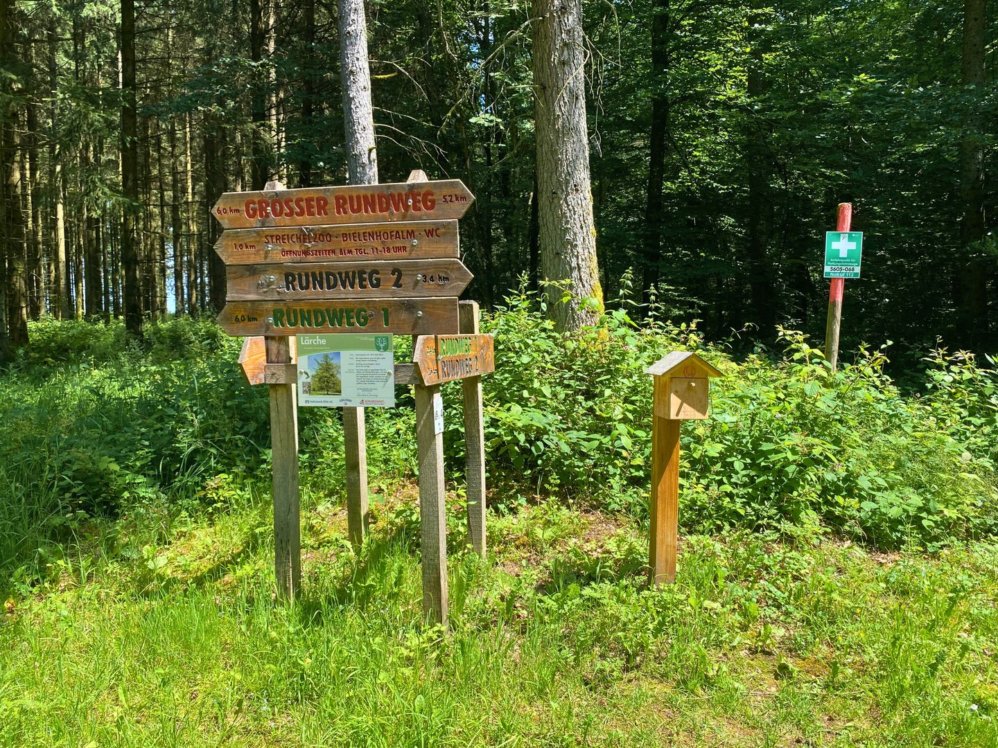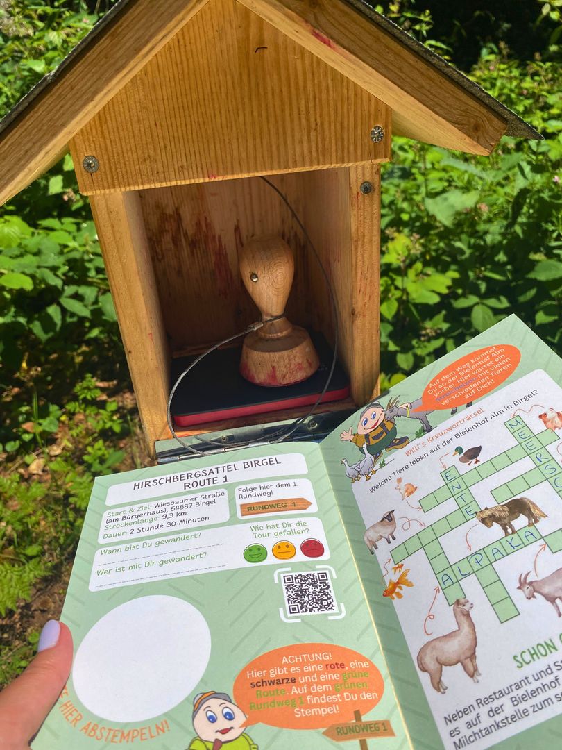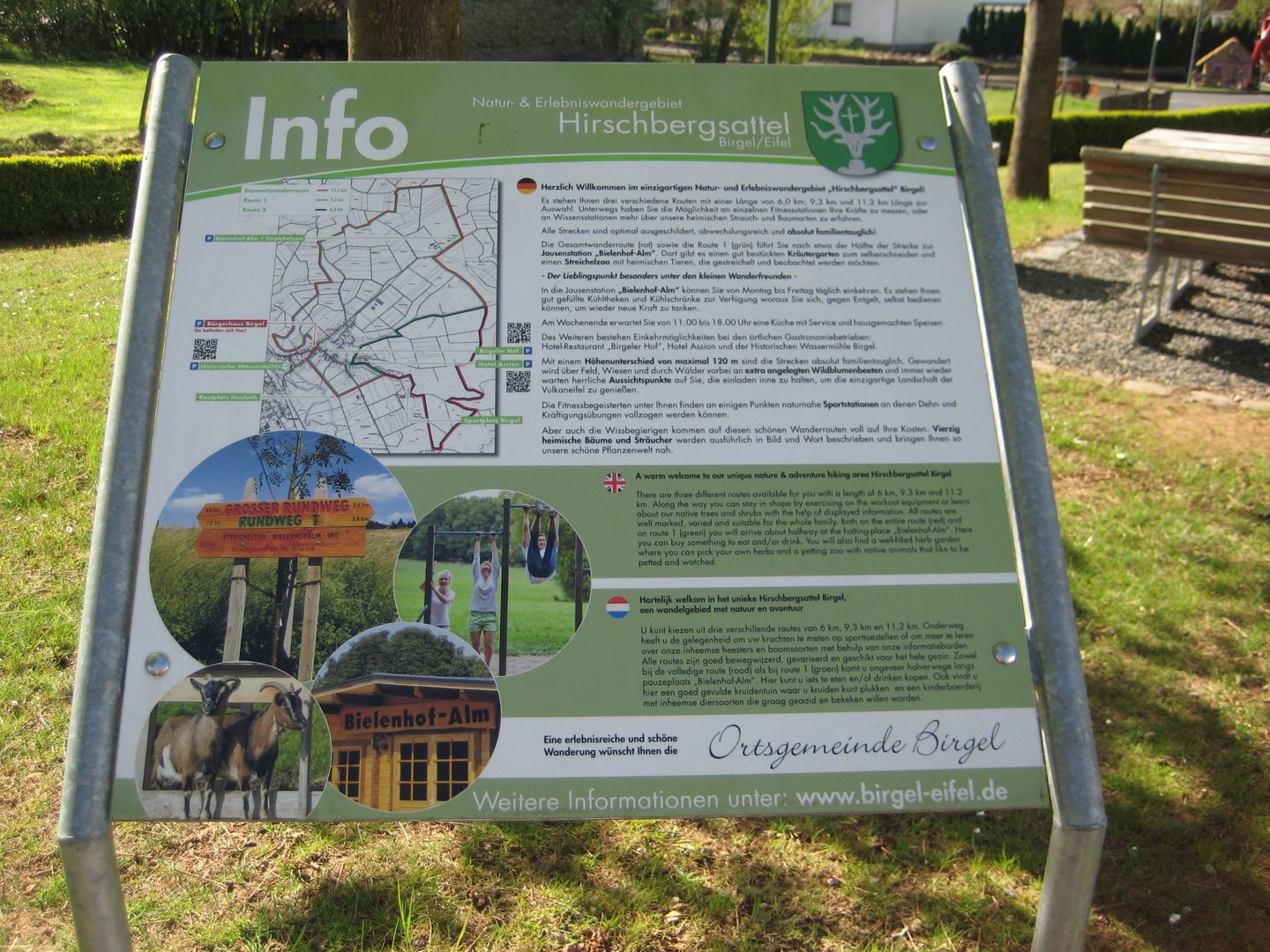 The starting point of this hike is the village of Birgel at the community centre in Wiesbaumer Straße. From here, the trail leads through the Hirschbergsattel nature and adventure area. The trail is well signposted with the lettering LB1 on a white square and is relatively easy to hike. Past some fitness stations, you reach the "Bielenholf Alm" about halfway through the hike. While the little hikers enjoy the petting zoo here, the grown-ups can help themselves to the rich refrigerated counter and fridges. At weekends, there are even home-cooked meals including service.