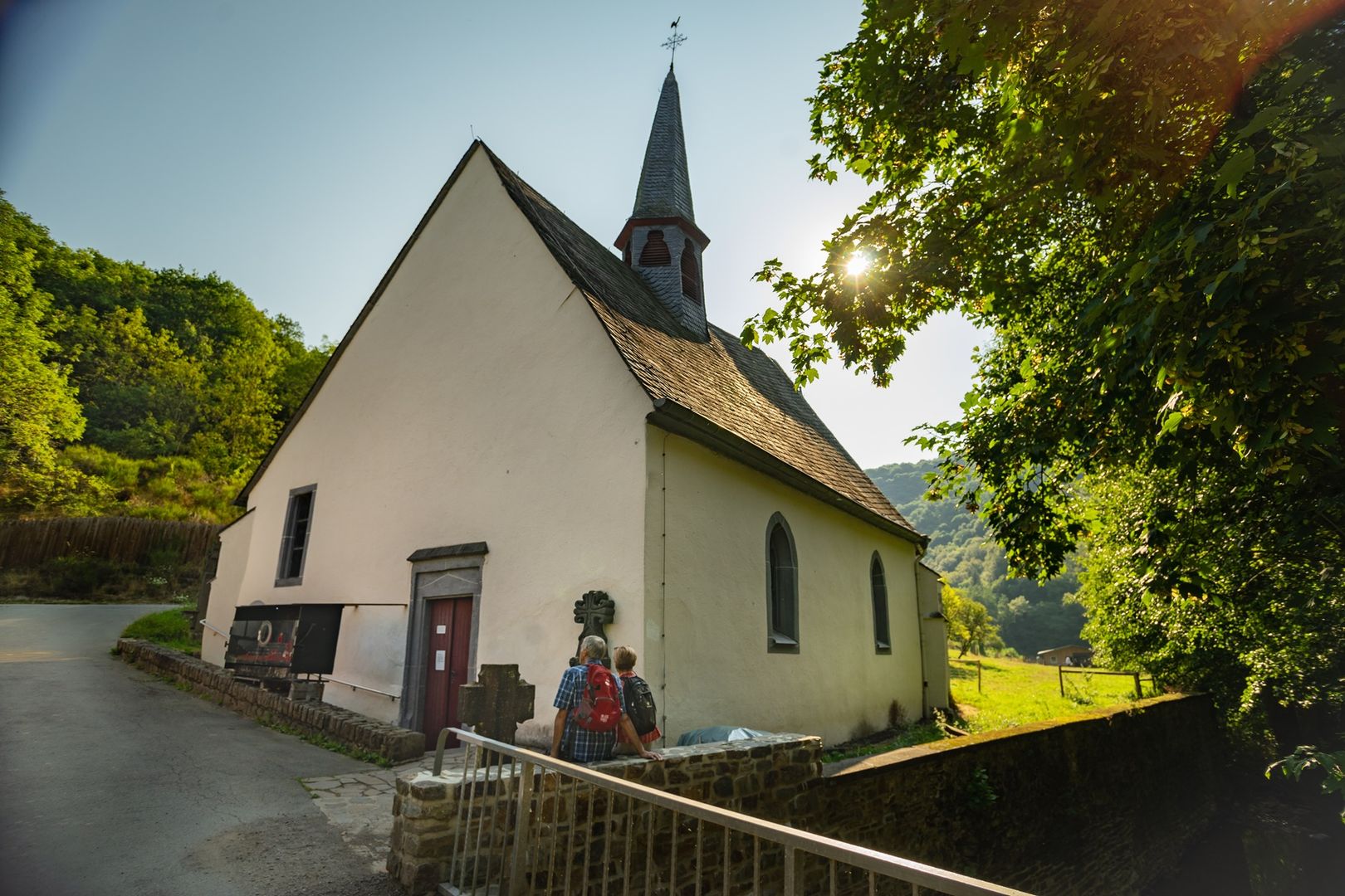 The Jodokusweg trail continues through the Nitztal valley to the Jodokus column and then via the villages of Welschenbach, Niederwelschenbach and Acht (where the restored Hubertus chapel is well worth a visit) through the forest back to Langenfeld.