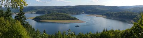 On the 5 km circular hiking tour "Meuchelberg [29]" near Heimbach, you can enjoy impressive Eifel views of the climatic health resort of Heimbach, the Heimbach reservoir, Hengebach Castle and the Art Nouveau hydroelectric power station as well as wonderful natural paths. The popular Rursee lake can also be seen. The climb up the mountain is particularly worthwhile in spring and fall, when the trees reveal the view of the reservoir thanks to the lack of leaves.