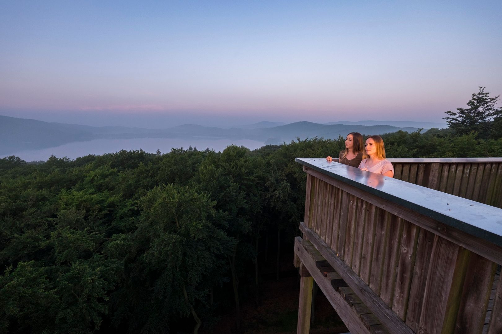 Now continue along the high-altitude circular trail for about 15 minutes, past a cross and a turn-off to the Lorenzfelsen rock. You come to a refuge at a crossroads. Two paths branch off to the left, take the one on the right. Slightly downhill, a little later at a fork in the path, stay left and continue downhill. The path then bends to the left, where 2 paths turn off downhill. Here the Vulkaneifelweg (V) joins the N path from the right. Stay on the N path and follow the path in the direction of the "Vulkan Waldfrieden" restaurant. Cross the road in front of the restaurant (walking time 1 hour). Pass the restaurant on the right and take the N path (signpost "Lydiaturm"). Walk behind the restaurant and after a few steps you will reach the observation tower. The 132 steps up to the platform are worthwhile, as you have a view over Lake Laach and into the hinterland to Wassenach and Burgbrohl.