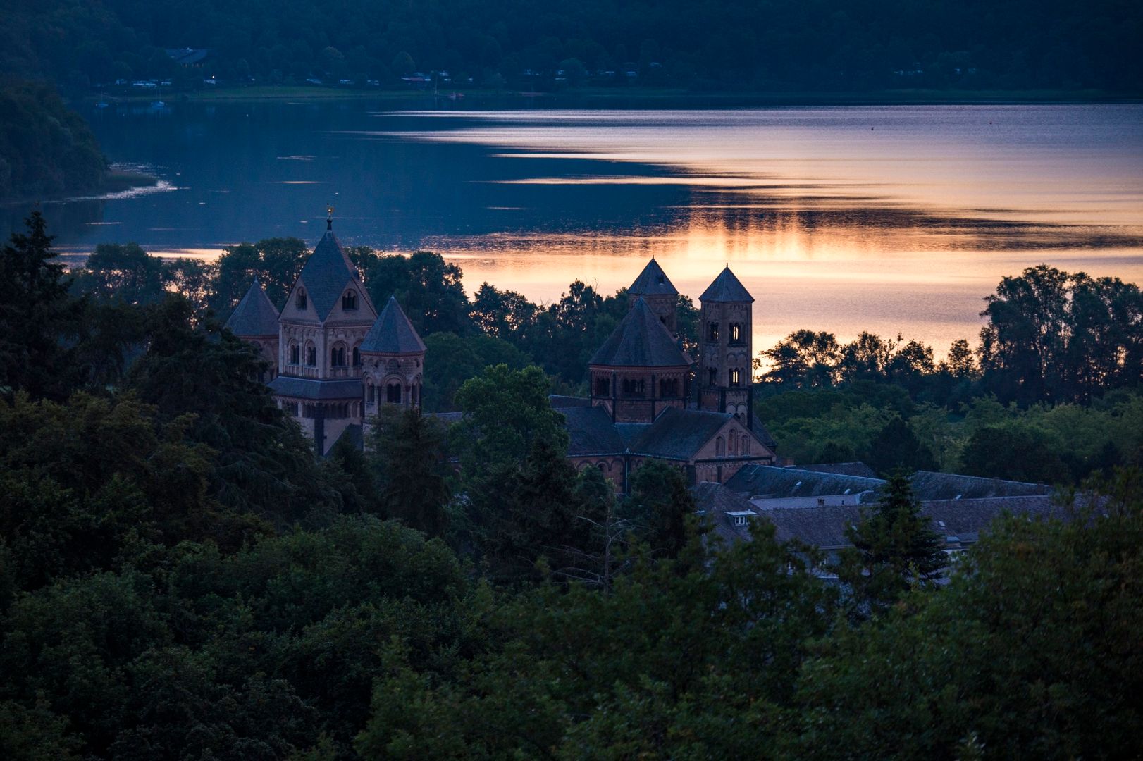 Continue along the edge of the forest for 30 meters and turn left into the forest (N path) at the next barrier leading into the field. 10 meters later, turn right at a fork (N-path and also the Laacher Kopf circular trail). Shortly afterwards you reach a refuge. Follow the N path to the left towards the lake. Continue down the N path until you reach a crossroads (main hiking trail of the Eifelverein, Jakobsweg, closed wedge sign). Turn left downhill and shortly afterwards you will reach the Maria Laach monastery.