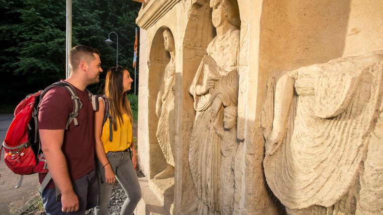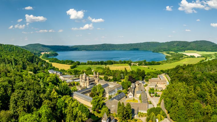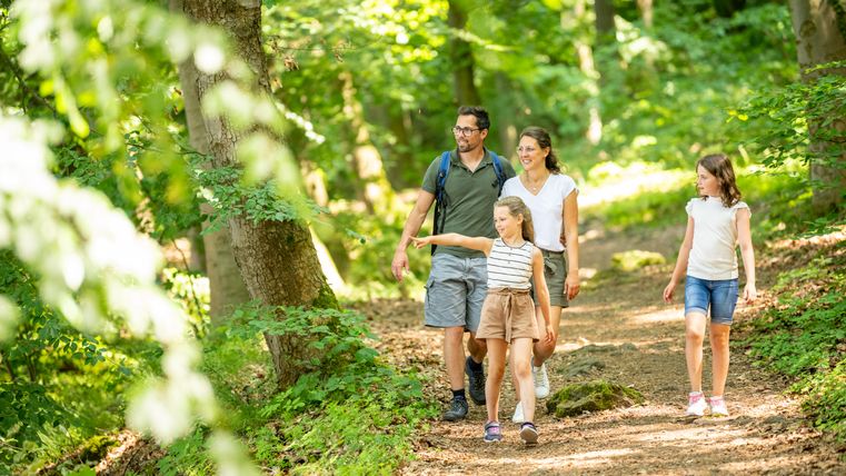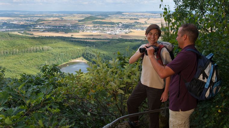 You start at the Roman burial site and take the path on the left up to the fork in the path, where you keep left and then immediately left again. The path leads past the "Black Wall". At the next fork, the path makes a detour to the Hermanshütte, where an impressive view awaits you. Now follow the lower path around to the right to the "Eppelsberg" landscape monument. Passing wooden sculptures, the path leads first left and then right towards the forest lake. Take the left-hand path next to the gate (entrance to the forest lake) and then turn left and then immediately right. The path leads steeply uphill to a path where you keep to the right before turning left shortly afterwards in serpentines to the "Teufelskanzel" viewpoint. The left-hand path now leads uphill in a right-hand bend. Stay on this path, making a small detour via the refuge at the Krufter Ofen. Then you come to a fork in the road, where you keep left. Turn right at the next crossroads. Follow the tarmac path to the left until the next fork, where you turn right onto the high-altitude circular trail and catch sight of Lake Laach. At the fork on the left, past a reddish tuff quarry, the path leads you onto another forest path, where you also keep left and reach the Aarefeldhütte. Take the right-hand path downhill and keep right at the next junction. The path now winds straight downhill back to Nickenich and the parking lot.