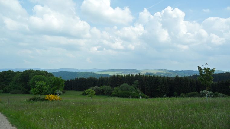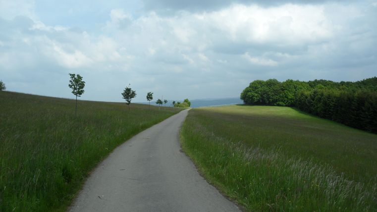 After an extended rest, we leave the chapel and follow the path downhill for a while until we reach a fork in the road, where we come to a tarmac farm track. We turn left and follow the path for one kilometer. Where the tarmac road ends, we reach a crossroads, which we cross. We are now on a meadow path which we follow downhill, always passing the meadow. At the end of the meadow, which is surrounded on three sides by pine forest, was once the Kottenborn farm. Here we turn right and walk past a wild field towards a crossroads which we cross straight ahead. Now we follow the path down into the valley until we reach the district road that leads to Wershofen.