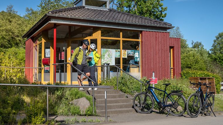 Highlights on this route include the Rur valley lined with red sandstone cliffs, the Eifel heights with their sweeping views and the idyllic Kallbach valley. There are two rest and adventure points along the route on the RurUfer cycle path. At the Zerkall National Park information point, you can learn interesting facts about the beaver in the Eifel and, in the evenings, about the eagle owl. The picnic groups installed there invite you to linger.
