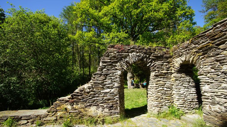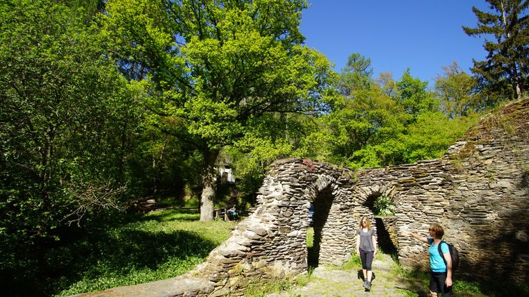 At the Hardterweg crossroads, the hiker first turns right and then left again and past the wind turbine in the direction of Düngenheimer Mühle/ Müsch into the idyllic Elz valley. From here you reach the main hiking trail of the Eifelverein: the Osteifelweg (Bonn-Mayen-Monreal-Moselkern). Follow the hiking trail in the Elzbachtal valley to the Lohbrücke bridge. Before the Lohbrücke bridge, turn right to reach the Mädburg monastery ruins. Here you have the option of walking straight ahead up into the Klosterbach valley, past the sewage treatment plant on the left and back to Kehrig (route 1 marked with a black dot). If you feel hungry or thirsty, you should hike up to the right at the sewage treatment plant to the Elztal Nord motorway service area for a short break. Keeping to the right at the Mädburgkapelle chapel, the slate hiking trail now leads left parallel to the Elzbach stream under the BAB-Elzbachtal bridge, still following the Osteifelweg trail, to the asphalt road to Kehrig. Turn left uphill to the BAB service area Elztal Süd. After a short rest, the route leads back through the highway underpass and past the sewage treatment plant in the direction of Kehrig (Elztalstraße). From there, continue to the village center on the right (Polcher-Straße) back to the church. Here it is also worth visiting the beautiful parish church of St. Castor and St. Katharina, which is brightly lit in the evening and can therefore be seen from afar.