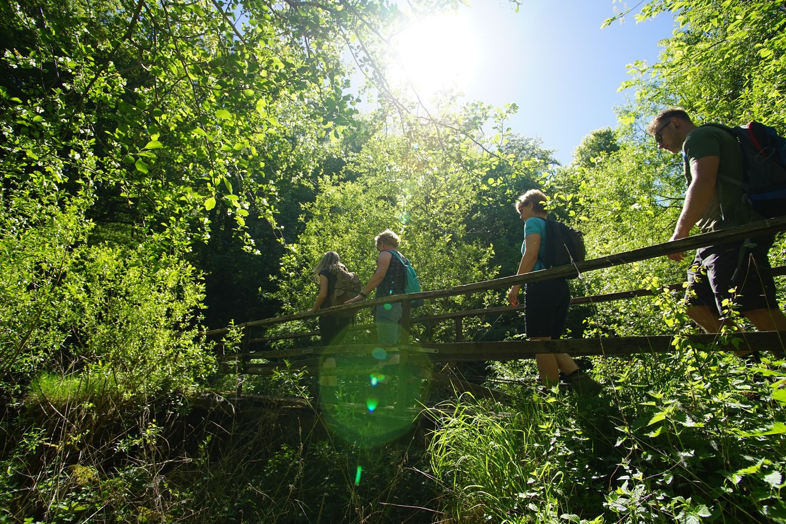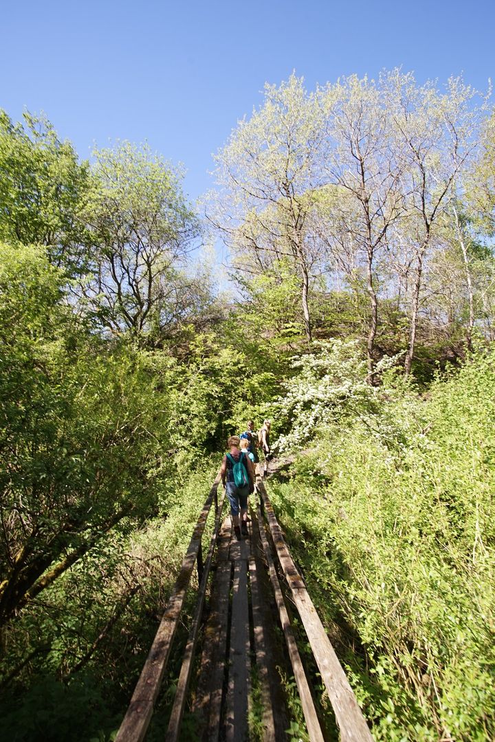 At the Hardterweg cross, the route initially descends to the left along the windbreak. The hiker then turns right again to reach the slate mine site of the former Bausberg II slate mine. The hiking trail leads downhill across the slate heap area through a beautiful meadow valley to the Bausberg I slate mine. Here you can also visit an open slate mine tunnel, but only from the outside for safety reasons. Once there, the route continues over the slag heap area on the right down to the Elzbach stream. Cross the Elz there and cross a small bridge to reach the slate hiking trail - Route 2. Follow the hiking trail in the Elzbach valley to the Lohbrücke bridge. Turn right before the Lohbrücke bridge to reach the Mädburg monastery ruins. Here, route 1 leads straight ahead up into the Klosterbach valley, past the sewage treatment plant on the left and back to the center of Kehrig.
