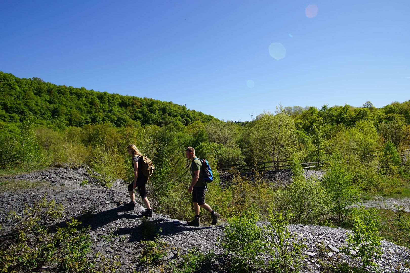 Starting from the parking lot in Brunnen-Heerbachstraße, the path leads up to the right (at Brunnen-Heerbachstraße no. 14) to the agricultural road. It runs behind the church on the left in the direction of the wind turbines, which are visible from afar. Here you cross the K25 at the entrance to Kehrig and the slate hiking trail continues along the agricultural road towards Wüsterrather Hof, past the windbreak. From here, on a clear day, you have a beautiful view of the Nürburg, the Hohe Acht, the local communities of Reudelsterz and Kürrenberg as well as the imposing elevations of the Hochsimmer, the Hochstein and the Ettringer Bellerberg. Passing the wind turbines on the left, the Schieferwanderweg forks into routes 1 and 2. Route 1, which is described here, is also marked with a black dot.