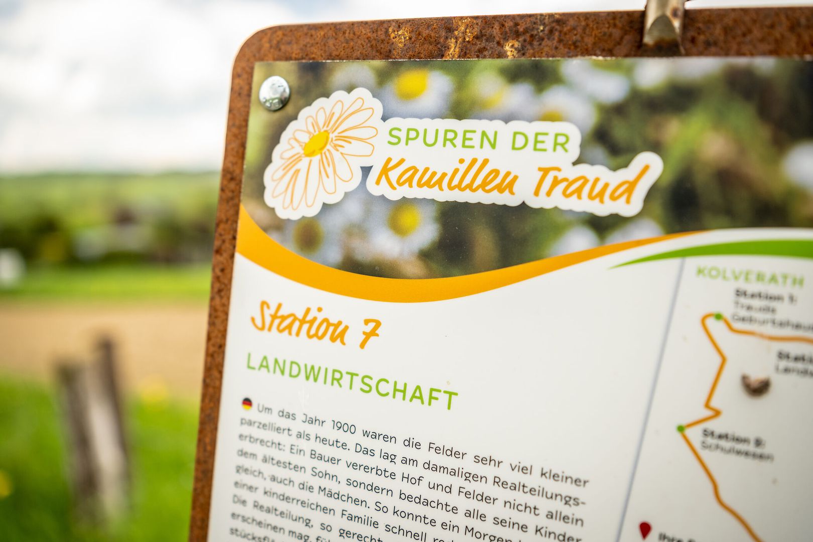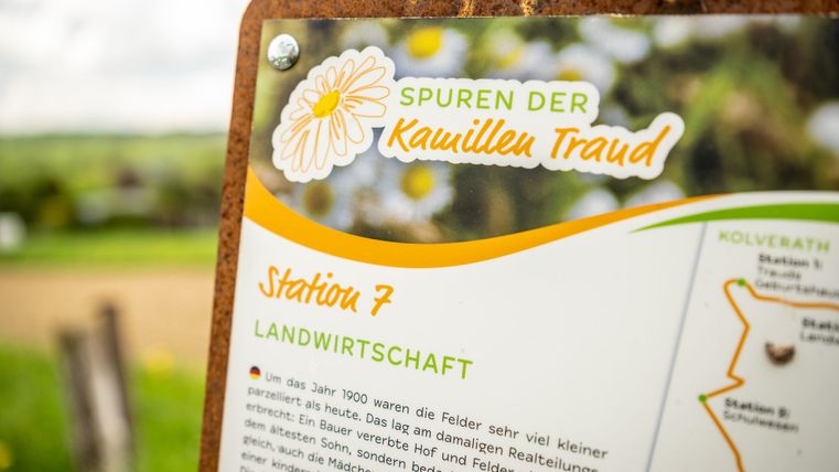 The "Traces of the Camomile Traud" theme trail has been expanded to include audio stations where visitors can immerse themselves in the fascinating world of the Camomile Traud. The audio contributions can be played in High German and Kolverather Platt.