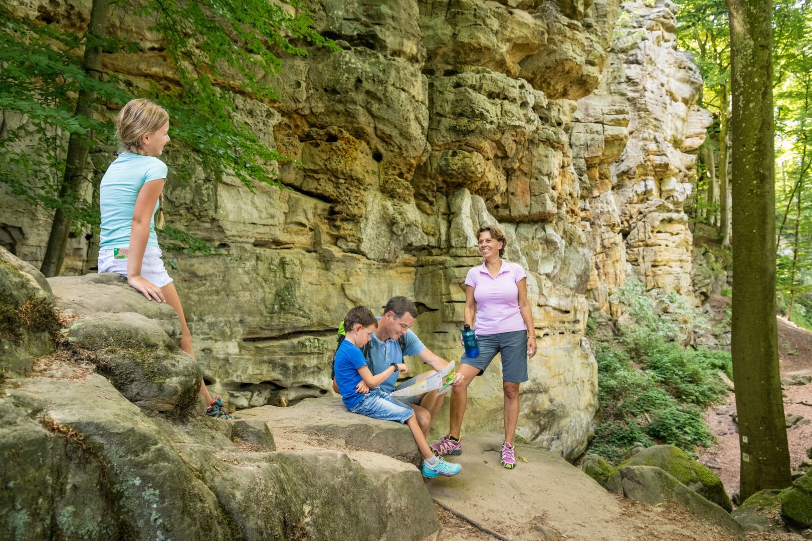 A glance at the map reveals why this hiking route in the Eifel is called the "Devil's Eight": its route resembles an eight and its namesake, the "Teufelsschlucht" (Devil's Gorge), is also the first highlight of the hiking adventure. From now on, the trail runs through a fascinating world of rocks. Narrow paths lead past mighty rock towers and wildly scattered boulders full of crevices, fissures and mysterious weathering.