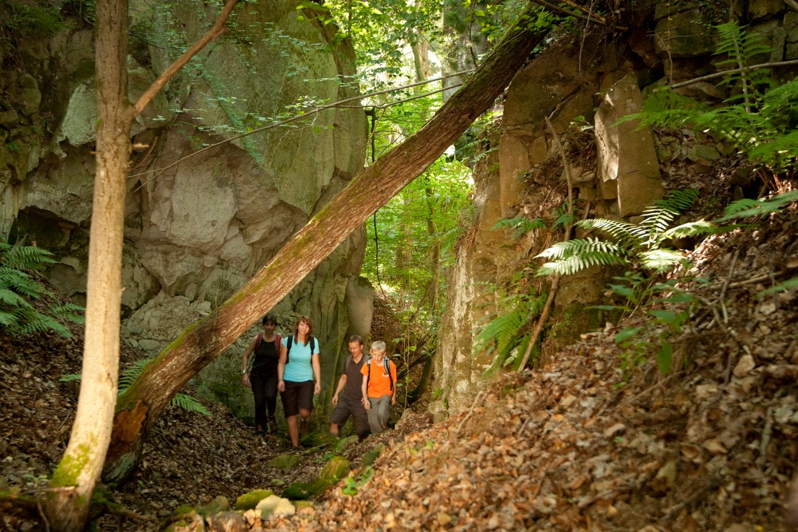 "So close to heaven!" is the motto of this dream trail in the Eifel: right at the start of the hike, a detour to the "Rauhbuur" rock area with its massive tuff walls is recommended. The trail continues over the bridge protecting an ant trail to the impressive rocky gorges of the Marxe-Lay and up to the Gänsehals. From this mountain, as well as from the three following peaks, hikers can enjoy breathtaking panoramic views. The last few kilometers lead to the legendary Genovevahöhle cave and the Sauer spring of the Erlenbrunnen fountain in Mendig.