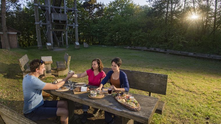 At a rest area with a volcanic outcrop, a lava bomb amazes hikers. After a short ascent, the wide path is reached again and shortly afterwards the blocked Eifel tower remains unnoticed on the left. The route runs through open terrain, allowing a great view over to Nürburg Castle. At Boosblick, two benches offer the opportunity to enjoy the view in peace and quiet