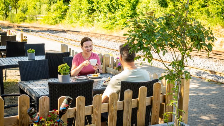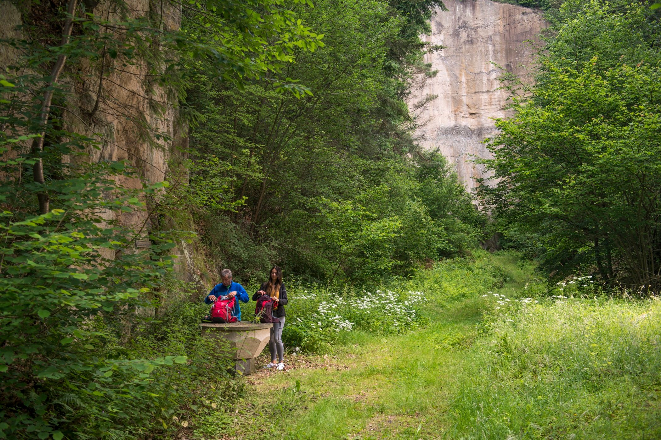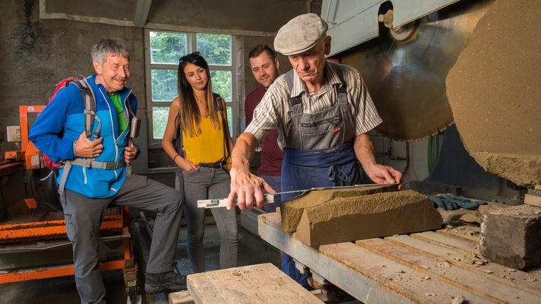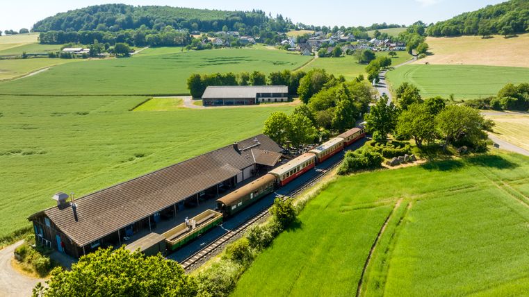 At the starting point, the geo-play garden introduces you to the geological eras represented in the region. From there, follow the sign towards Weibern, turn right after the road underpass and walk along the quarries into the village of Weibern. You will come to the L114 at a former stonemason's workshop. Turn right here and you will find the "Tufsteinschaufenster" at the entrance to the village. At the old quarry crane, turn left to the stone sawmill. From there, continue to the quarry "In den Lärchen" O2. You can then either walk over the Riedener Berg O3 and O4 to Weibern, or you can return to the village with its beautiful tufa houses and to the "Steinmetzbahnhof" (stonemason's station) O5, which is used as a tufa museum. Continue along the tufa road to Sandkaul. Follow the signposts on the black basalt stone towards Humersberg. Continue along field and forest paths to the Bernhardus Chapel. Turn right before the chapel and follow the markings. In Kempenich, walk along the country road towards Bad Neuenahr and turn right after approx. 150 m. A detour to a phonolite outcrop is possible via steps. At the top, after a few meters, a bridge leads over the main road, keep left, cross the road and walk along field paths with striking rows of trees to the sand pit in Engeln. After the loop through the Engelner Kopf forest, turn back towards the train station in the village.