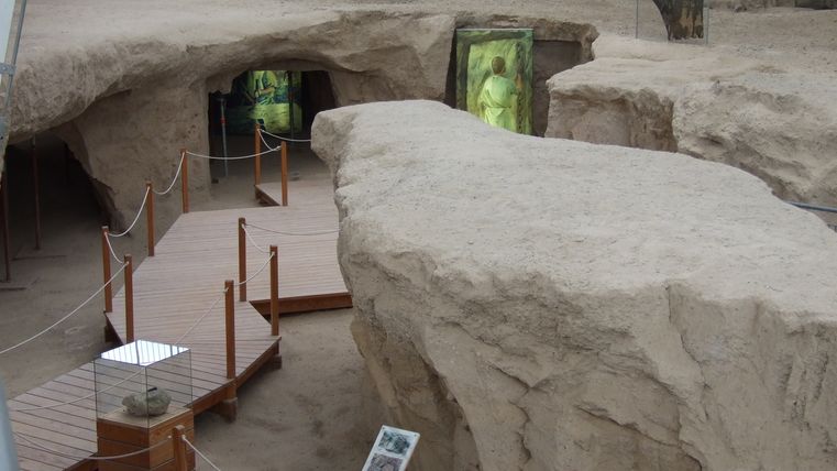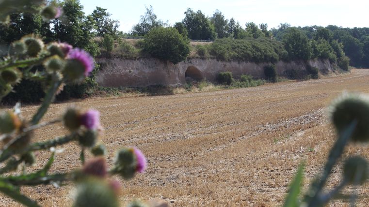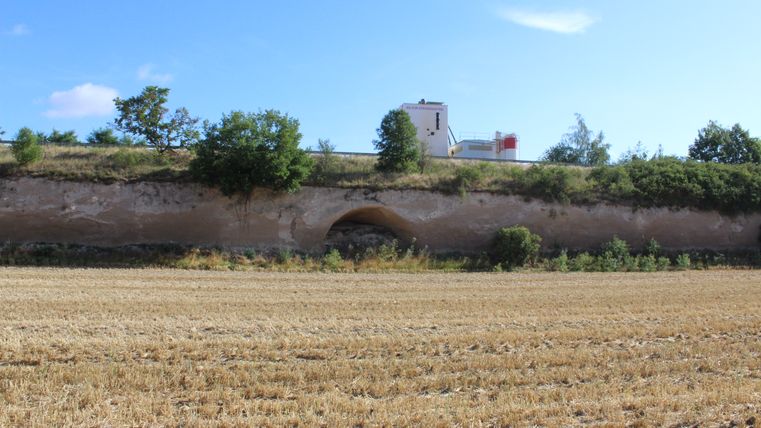 Follow Bahnhofsstraße a little way up to the right and then turn into Friedhofsstraße opposite the Volksbank. This leads you first past the cemetery and then past the town hall of the Pellenz municipality. You will now see a sports field and the "Pommerhof", an old estate with a long history. Cross the country road there and follow the path straight ahead until you come to a larger road, which you follow to the left for approx. 20 meters, then turn left again directly into a field path. Keep right at the next fork in the road. The path takes you past the "Krufter Bachtal" landscape monument. Here you can still see old tunnels in the tufa, which were created for mining the volcanic rock. Continue straight ahead until you reach the small village of Kretz. Here you follow the main road and then a little way down the road "In der Hohl" until you see the "Hahnenwiesenweg" on your right. This leads you along the Krufter Bach stream to an underpass, which takes you to Mühlenstraße. Follow this road across Meurinstraße and along a small meadow to the parking lot of the Römerberwerk Meurin. From here, a footpath leads past an idyllic fishing meadow to the impressive mine with its accessible tunnels and antique technical equipment.