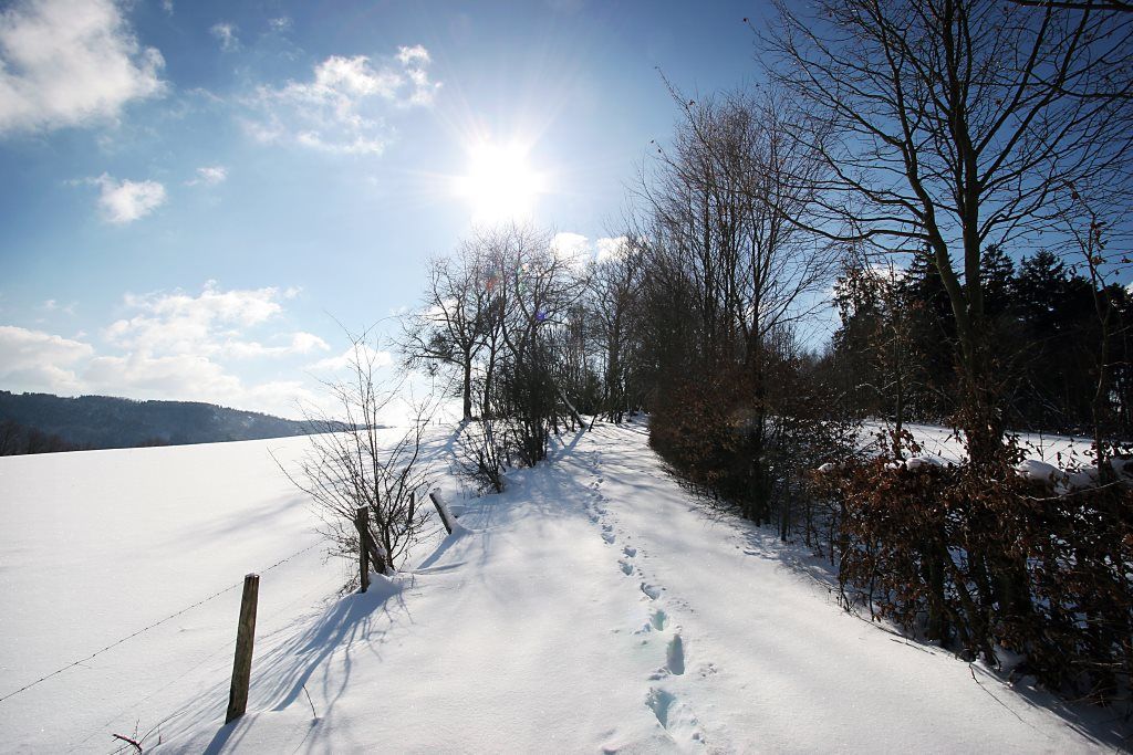 Winter hike along sunny paths through the snow-covered Eifel. Circular hike near Schöneseiffen.