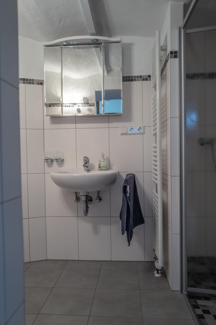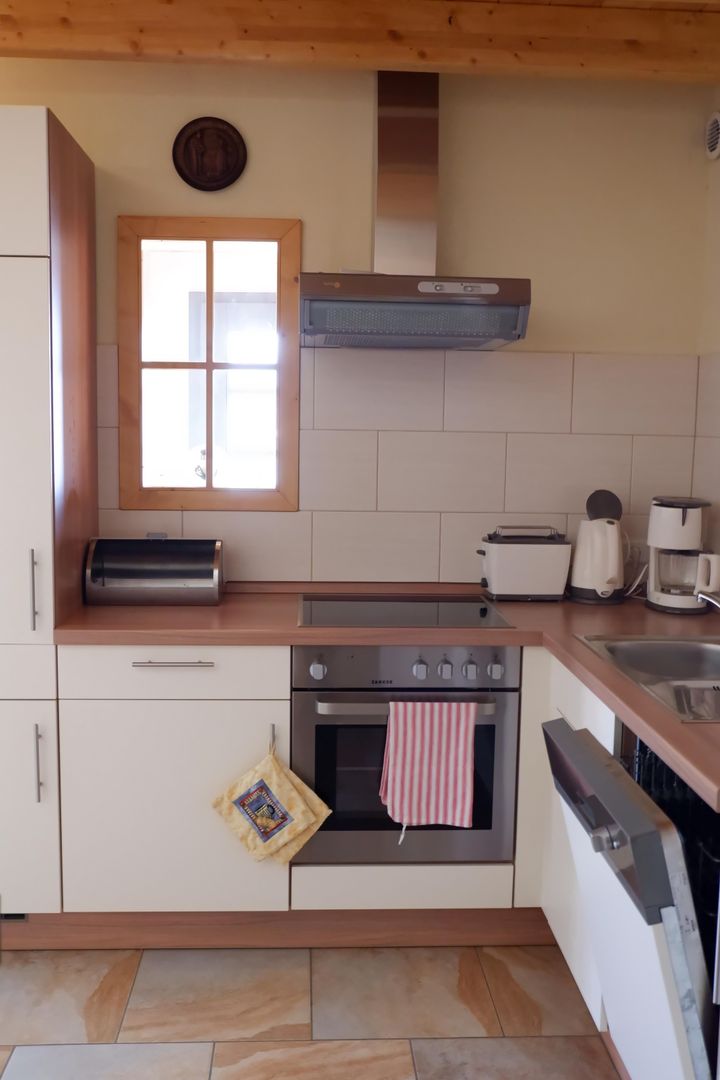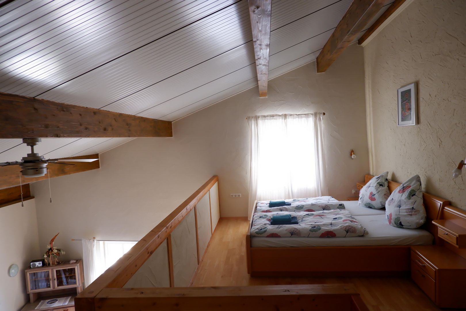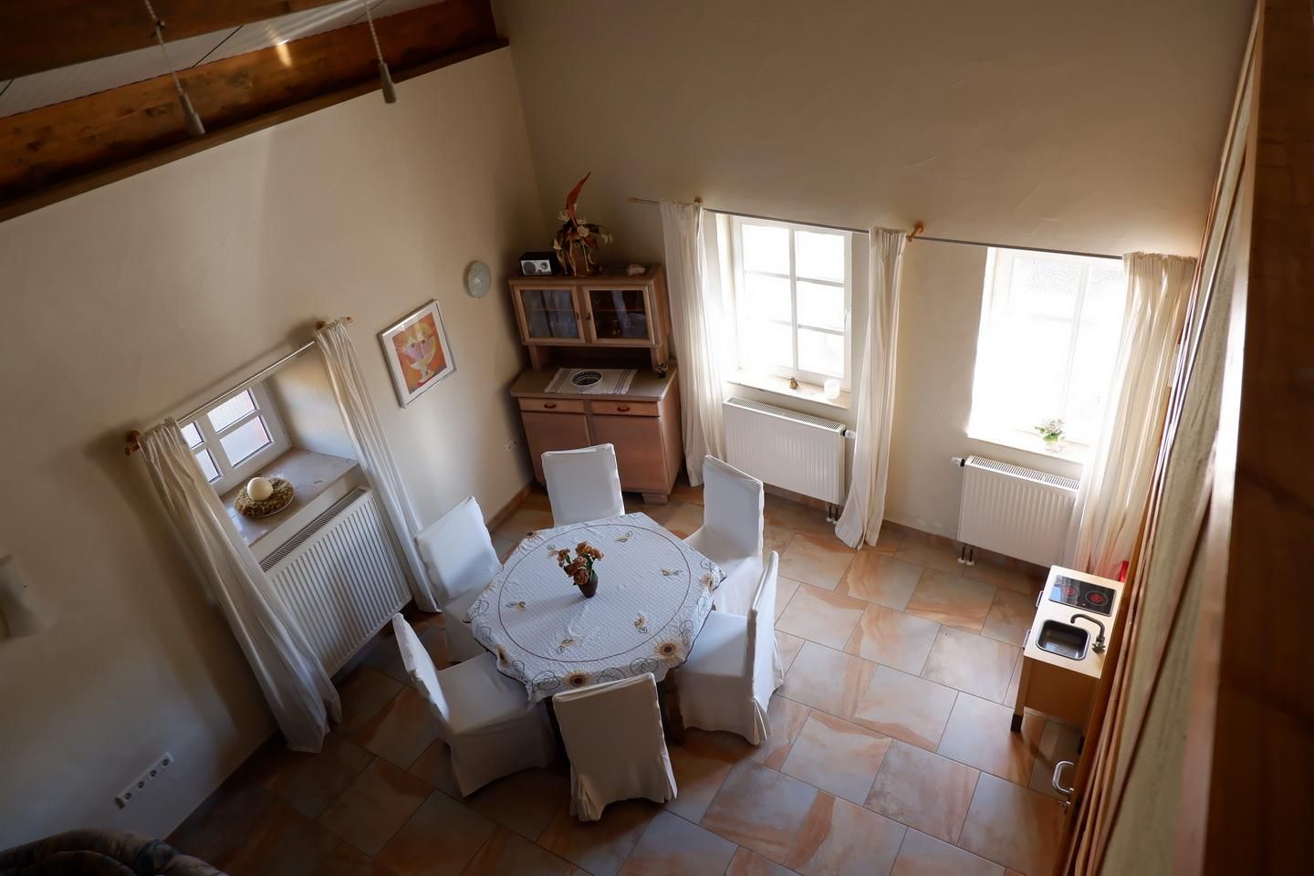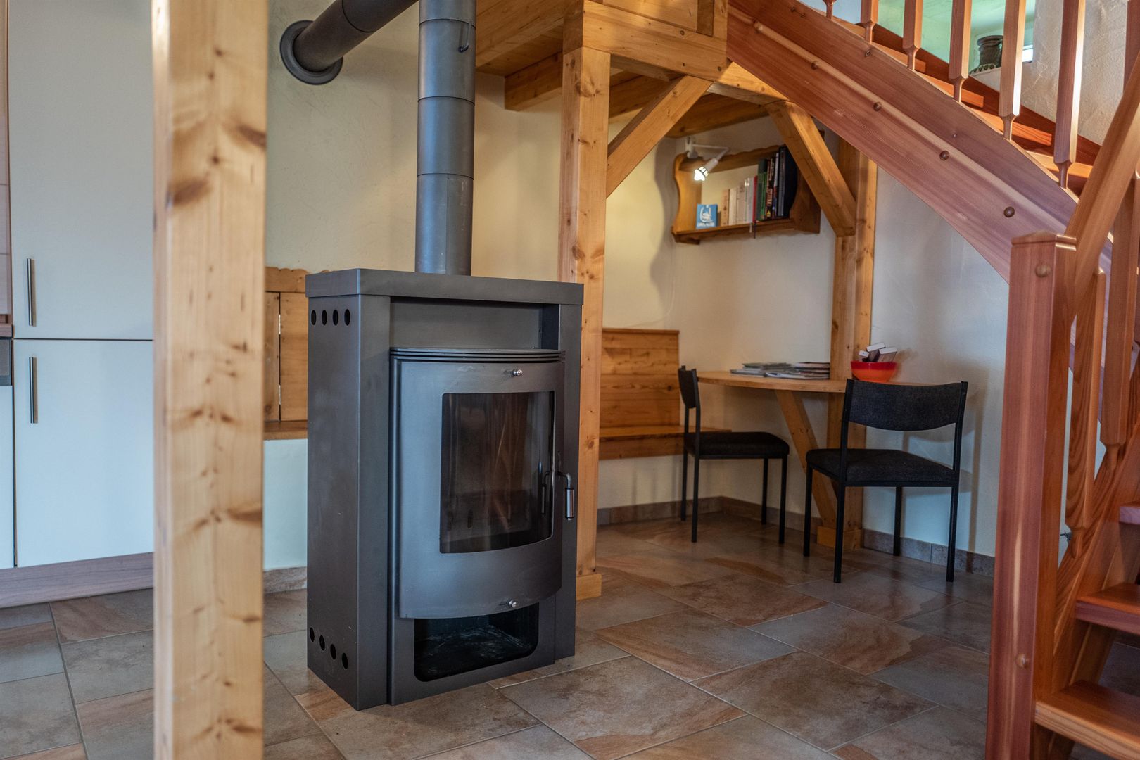 The vacation apartment is built into a former barn. It has a large living room with adjoining kitchen area, a fireplace, a dining area and a living area with sofa (can be converted into a sofa bed). A wooden staircase leads to the gallery with the sleeping area. From the entrance, however, you first enter the hallway with checkroom and the modern bathroom with walk-in shower.