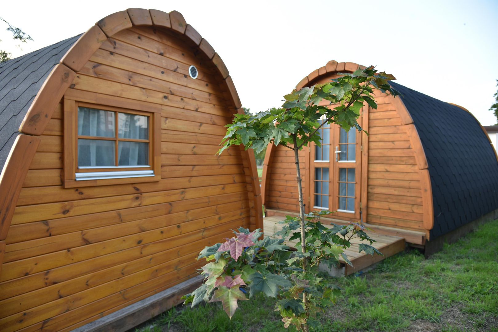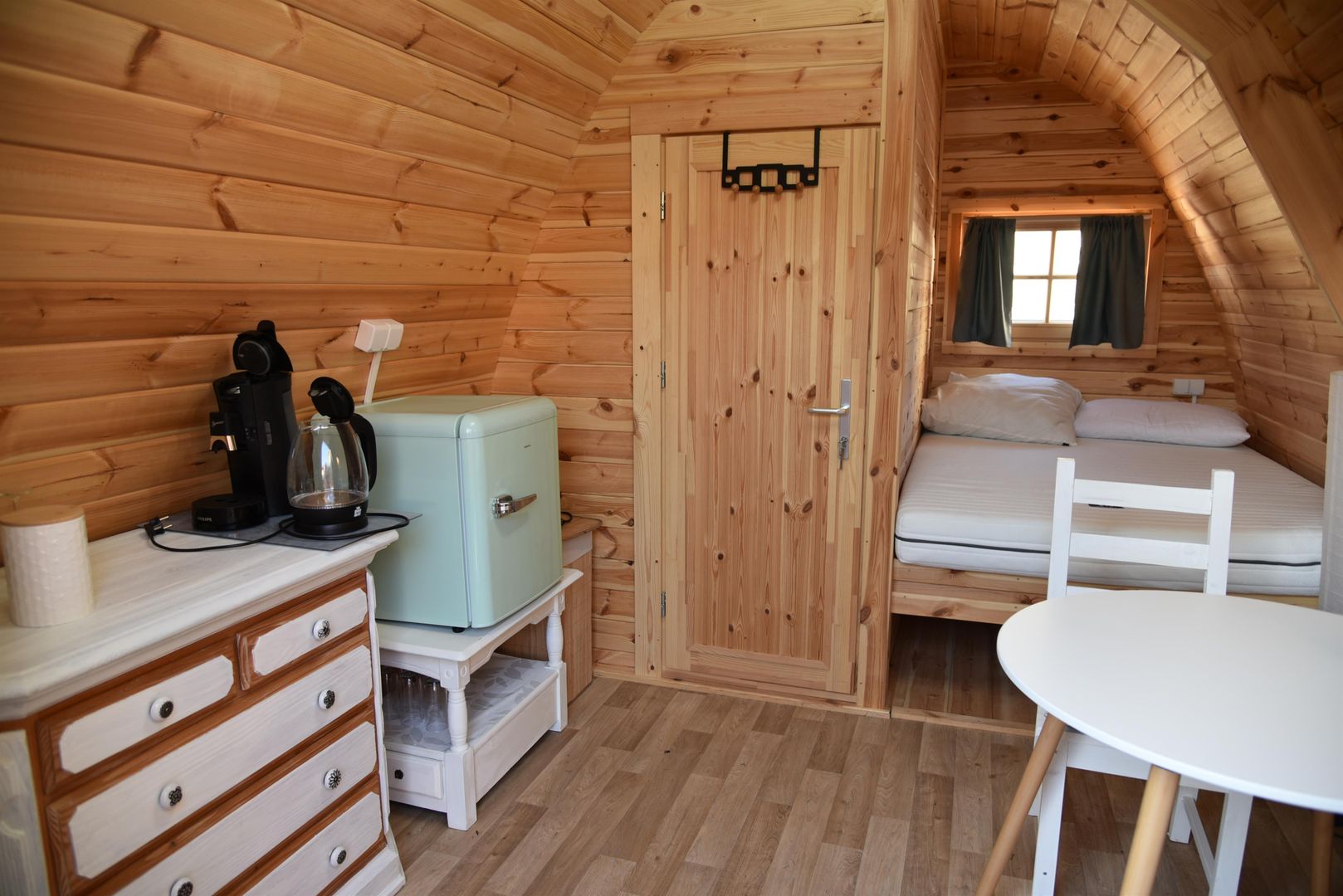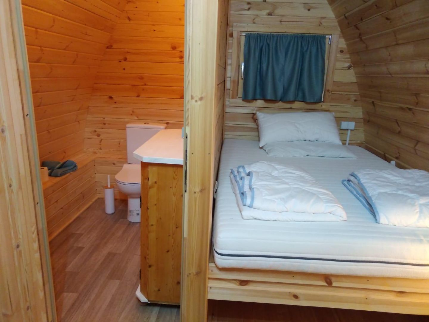 Two spacious camping pods with double beds await you upon arrival. A separate room with toilet and sink is also integrated. The tea kitchen with refrigerator, coffee machine, a table with two chairs is also part of the furniture. A sanitary building with a shower and toilet is just a few steps away.