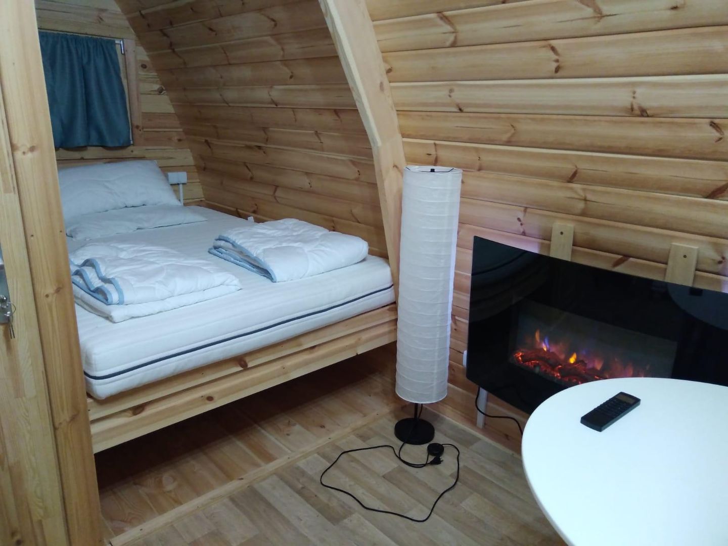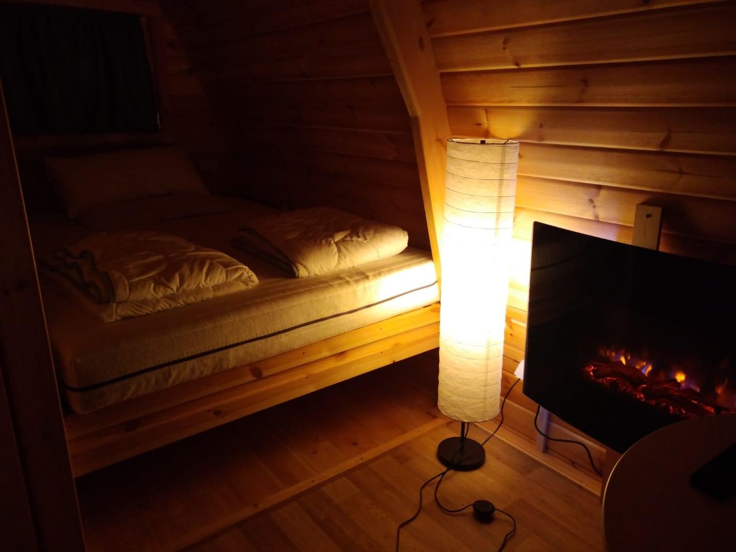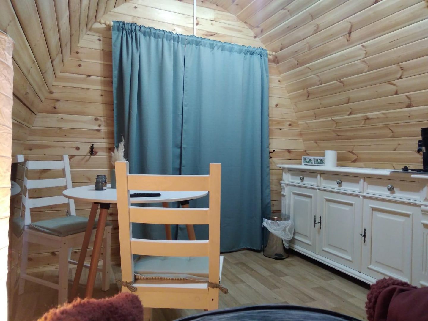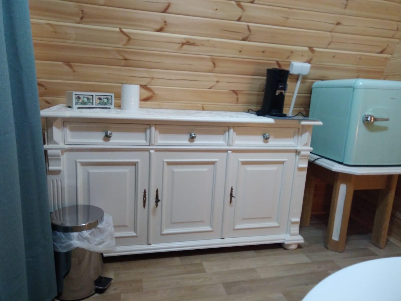 Two spacious camping pods with double beds await you upon arrival. A separate room with toilet and sink is also integrated. The tea kitchen with refrigerator, coffee machine, a table with two chairs is also part of the furniture. A sanitary building with a shower and toilet is just a few steps away.