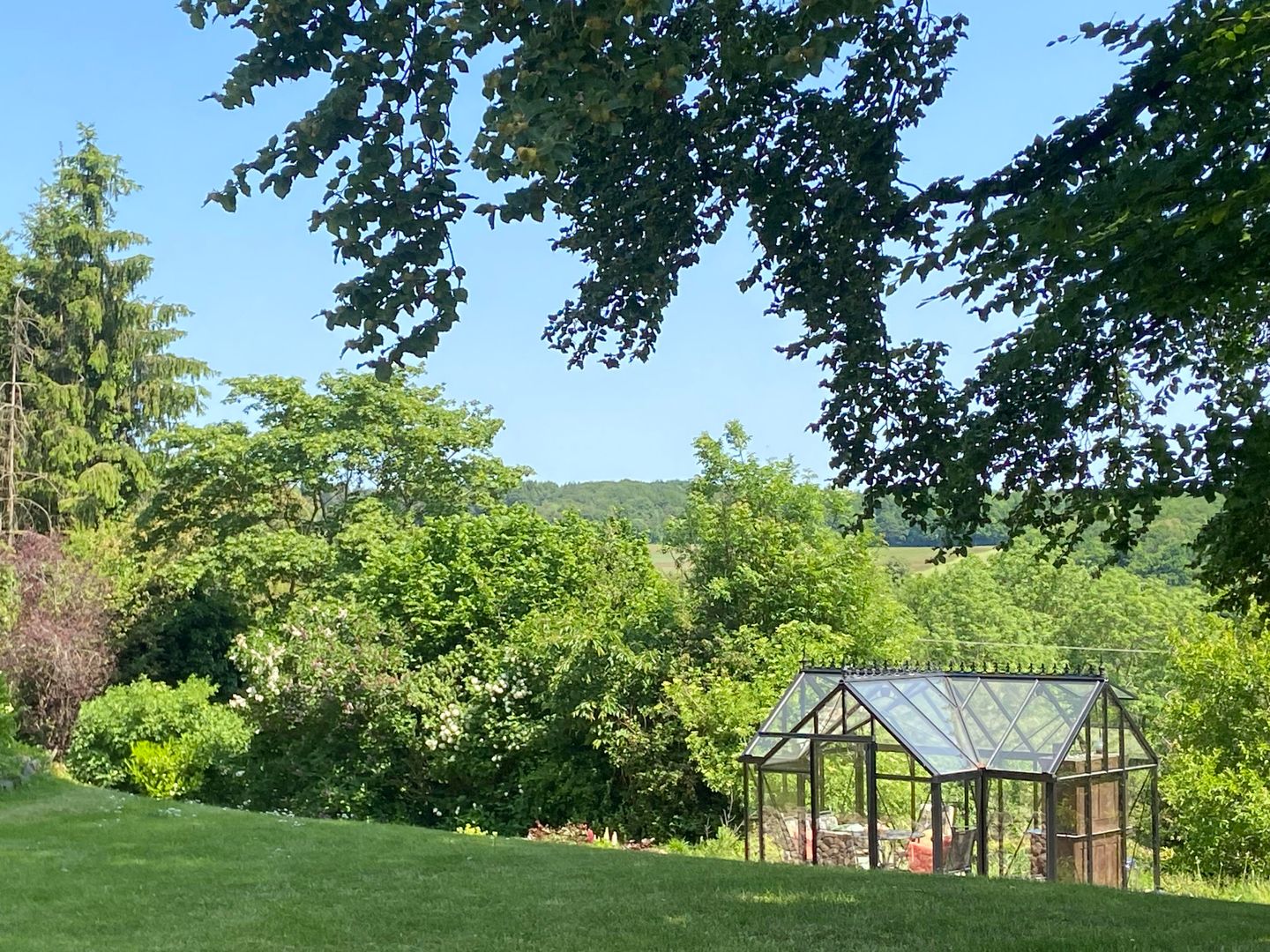 On the upper floor, the vacation apartment "The Crown" offers a wonderful view of the garden and the surrounding hills from its balcony.