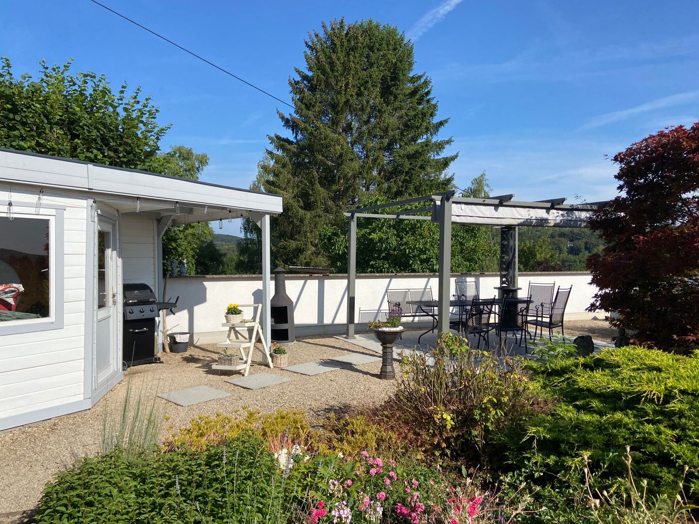 Next to it is the sauna with its pebble terrace.