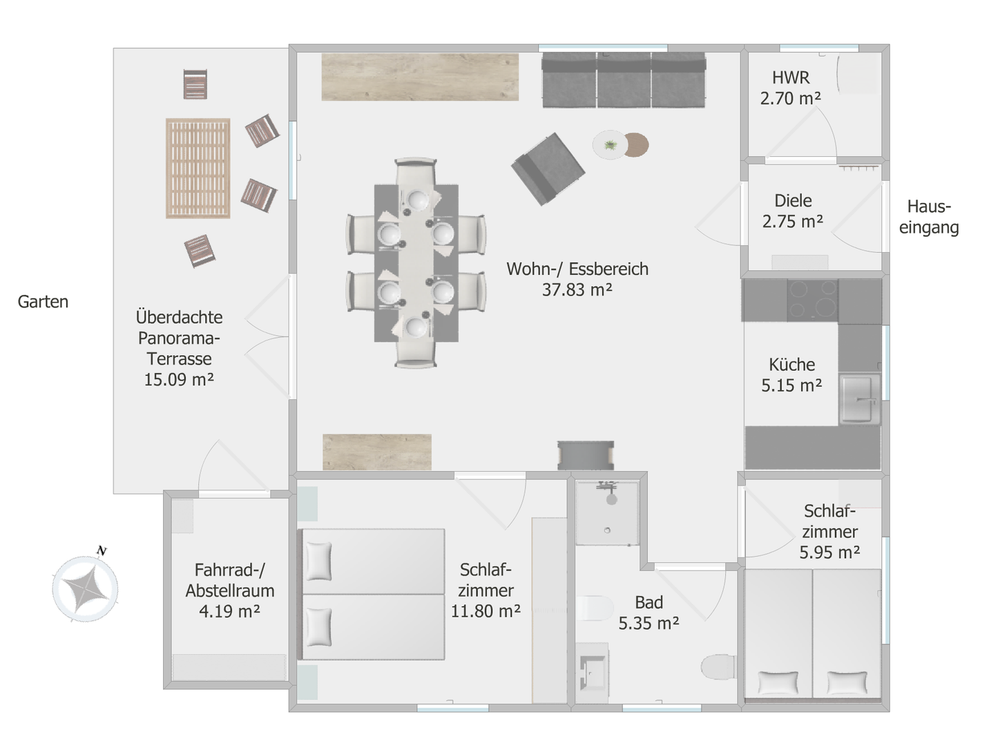 Our holiday home has a living area of 91 m2 and is divided into two bedrooms, a bathroom, a utility room, a hallway, and a large living/dining room with a fully equipped kitchen. Adjacent to the large covered terrace, there is a lockable storage room for, for example, bicycles. Part of the garden can be shared, and there is a large parking space directly at the holiday home on the property.
